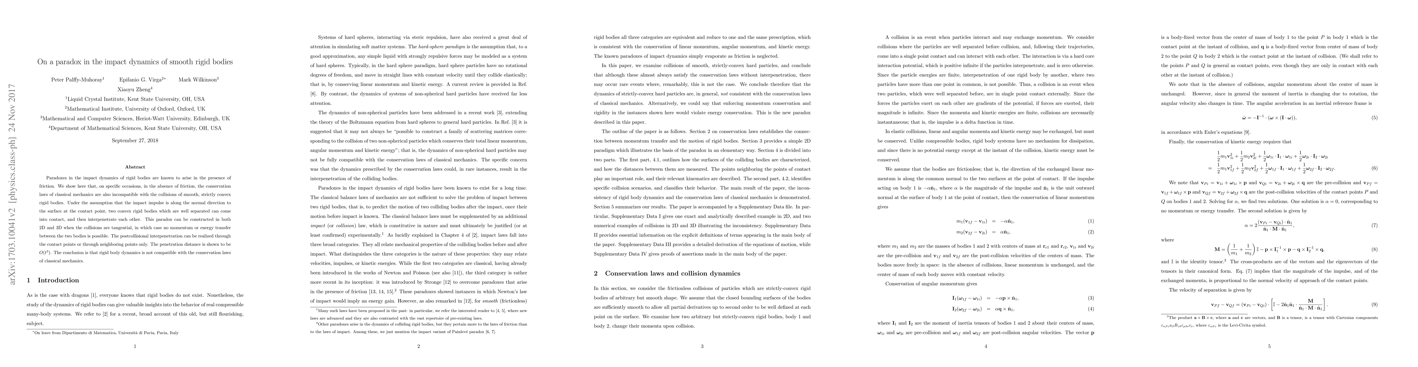 Paradoxes in the impact dynamics of rigid bodies are known to arise in the presence of friction. We show here that, on specificc occasions, in the absence of friction, the conservation laws of classical mechanics are also incompatible with the collisions of smooth, strictly convex rigid bodies. Under the assumption that the impact impulse is along the normal direction to the surface at the contact point, two convex rigid bodies which are well separated can come into contact, and then interpenetrate each other. This paradox can be constructed in both 2D and 3D when the collisions are tangential, in which case no momentum or energy transfer between the two bodies is possible. The postcollisional interpenetration can be realized through the contact points or through neighboring points only. The penetration distance is shown to be O(t^3). The conclusion is that rigid body dynamics is not compatible with the conservation laws of classical mechanics.