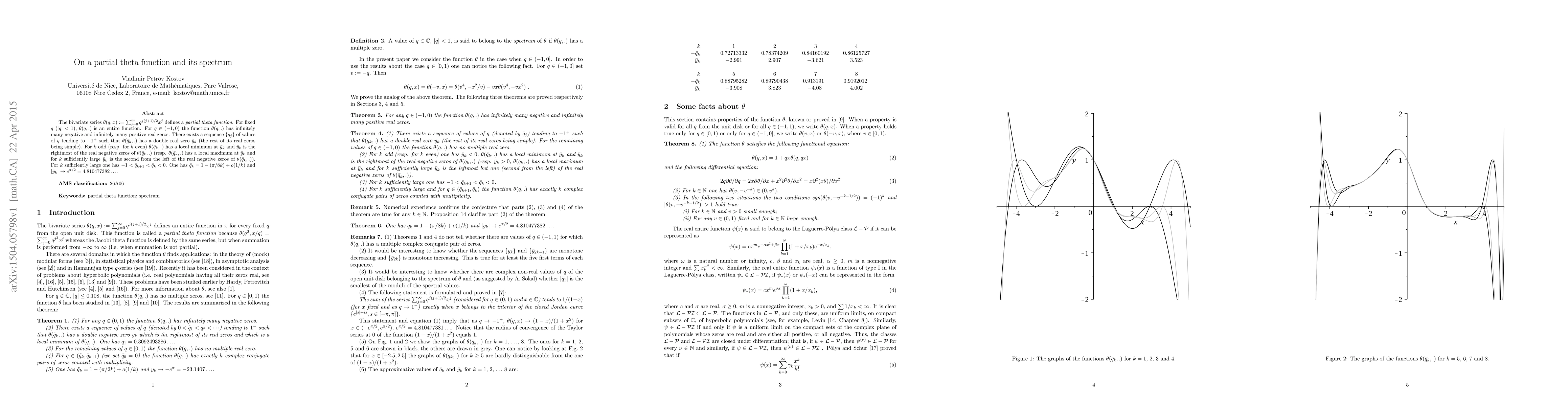 The bivariate series $\theta (q,x):=\sum _{j=0}^{\infty}q^{j(j+1)/2}x^j$ %(where $(q,x)\in {\bf C}^2$, $|q|<1$) defines a {\em partial theta function}. For fixed $q$ ($|q|<1$), $\theta (q,.)$ is an entire function. For $q\in (-1,0)$ the function $\theta (q,.)$ has infinitely many negative and infinitely many positive real zeros. There exists a sequence $\{ \bar{q}_j\}$ of values of $q$ tending to $-1^+$ such that $\theta (\bar{q}_k,.)$ has a double real zero $\bar{y}_k$ (the rest of its real zeros being simple). For $k$ odd (resp. for $k$ even) $\theta (\bar{q}_k,.)$ has a local minimum at $\bar{y}_k$ and $\bar{y}_k$ is the rightmost of the real negative zeros of $\theta (\bar{q}_k,.)$ (resp. $\theta (\bar{q}_k,.)$ has a local maximum at $\bar{y}_k$ and for $k$ sufficiently large $\bar{y}_k$ is the second from the left of the real negative zeros of $\theta (\bar{q}_k,.)$). For $k$ sufficiently large one has $-1<\bar{q}_{k+1}<\bar{q}_k<0$. One has $\bar{q}_k=1-(\pi /8k)+o(1/k)$ and $|\bar{y}_k|\rightarrow e^{\pi /2}=4.810477382\ldots$.