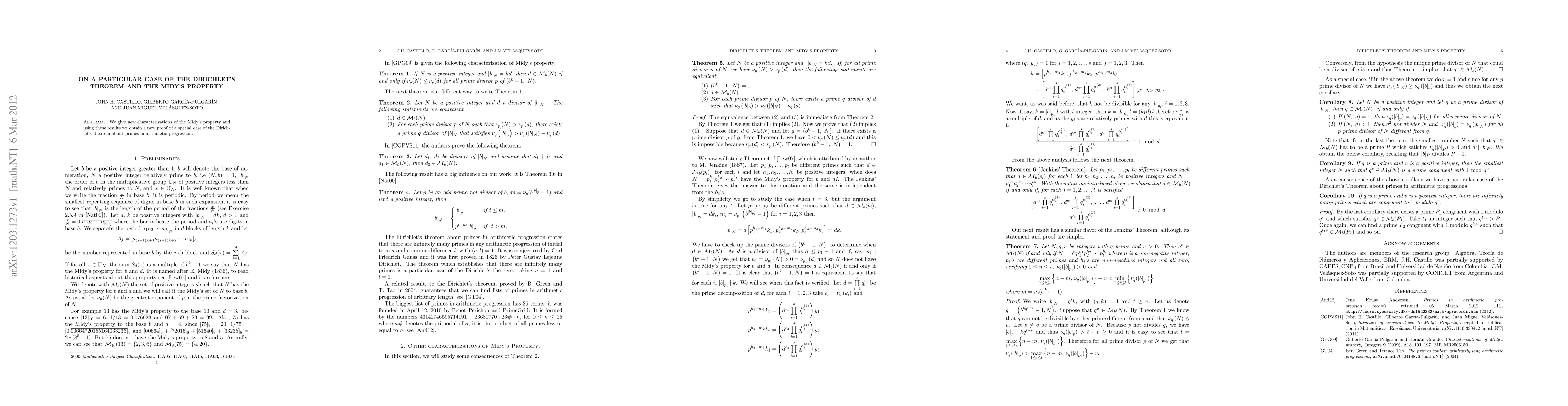 We give new characterizations of the Midy's property and using these results we obtain a new proof of a special case of the Dirichlet's theorem about primes in arithmetic progression.