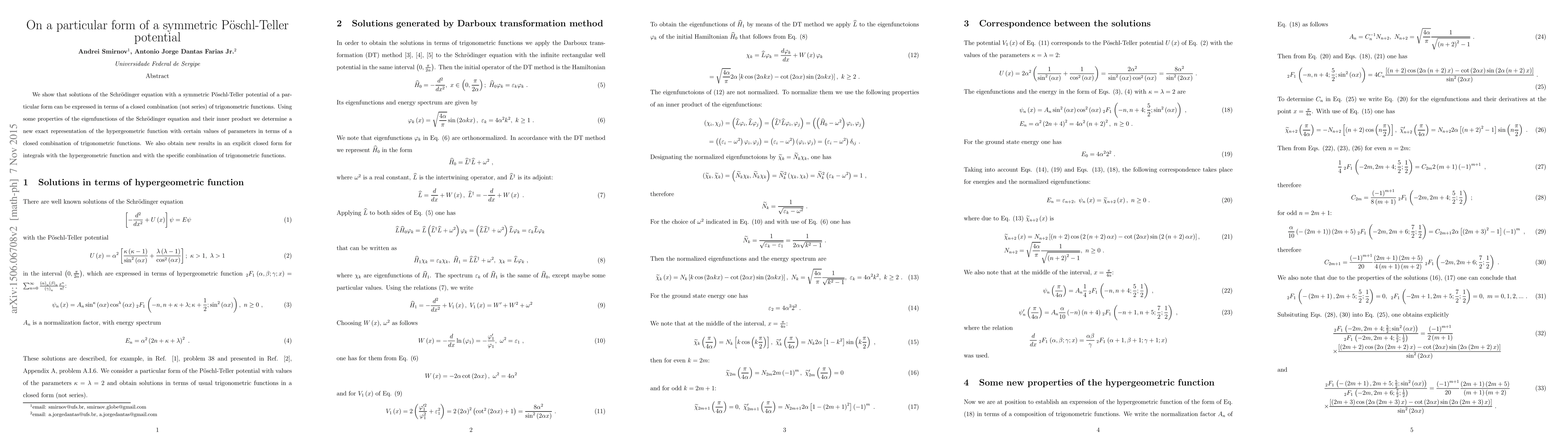 We show that solutions of the Schr\"odinger equation with a symmetric P\"oschl-Teller potential of a particular form can be expressed in terms of a closed combination (not series) of trigonometric functions. Using some properties of the eigenfunctions of the Schr\"odinger equation and their inner product we determine a new exact representation of the hypergeometric function with certain values of parameters in terms of a closed combination of trigonometric functions. We also obtain new results in an explicit closed form for integrals with the hypergeometric function and with the specific combination of trigonometric functions.