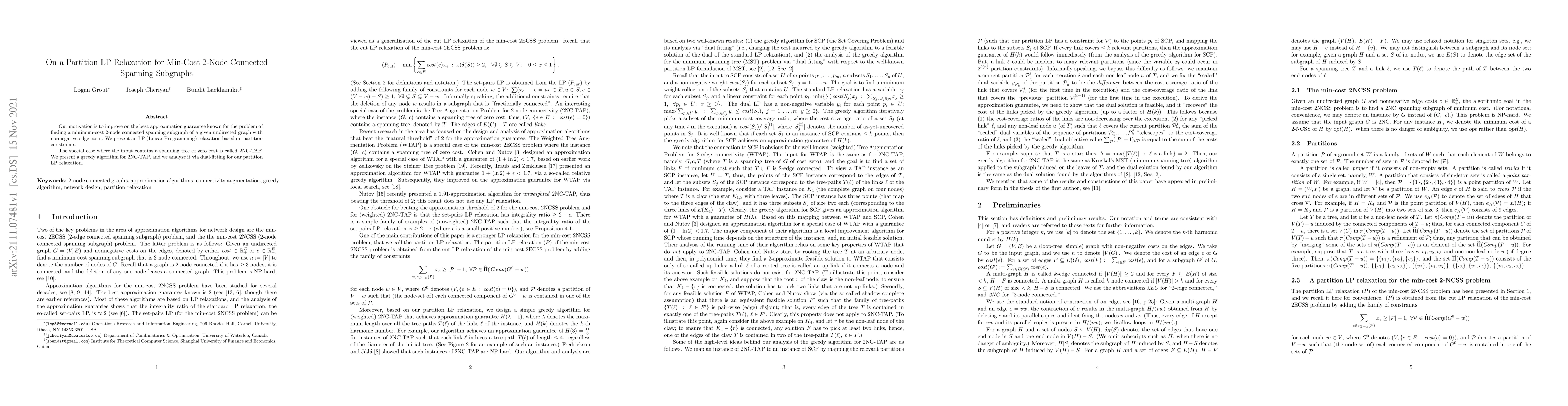 This paper proposes an LP relaxation based on partition constraints to improve the approximation guarantee for finding the minimum-cost 2-node connected spanning subgraph in undirected graphs. It introduces a greedy algorithm for the special case 2NC-TAP and analyzes it using dual-fitting for the partition LP relaxation.