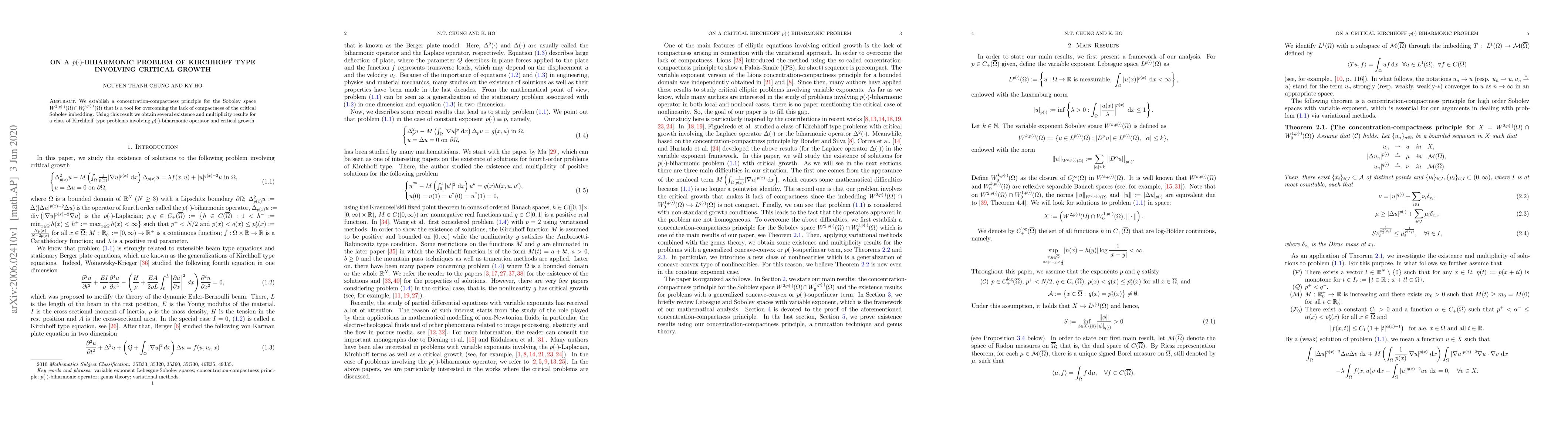 Summary: This research establishes a concentration-compactness principle for a Sobolev space to address the lack of compactness in critical Sobolev embeddings. It leverages this principle to prove existence and multiplicity results for Kirchhoff-type problems involving a $p(\cdot)$-biharmonic operator and critical growth.