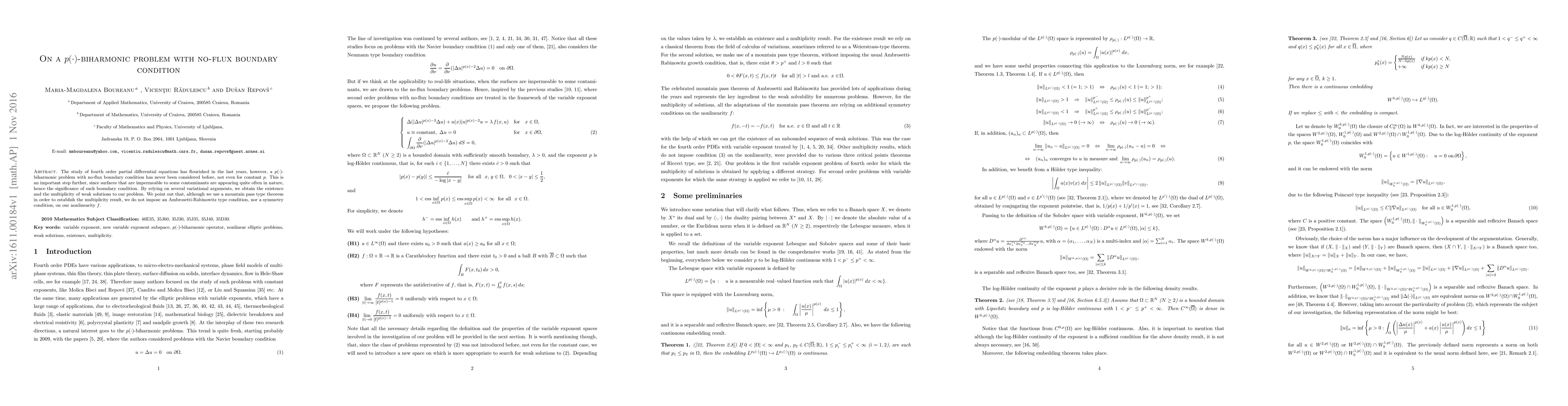 The study of fourth order partial differential equations has flourished in the last years, however, a $p(\cdot)$-biharmonic problem with no-flux boundary condition has never been considered before, not even for constant $p$. This is an important step further, since surfaces that are impermeable to some contaminants are appearing quite often in nature, hence the significance of such boundary condition. By relying on several variational arguments, we obtain the existence and the multiplicity of weak solutions to our problem. We point out that, although we use a mountain pass type theorem in order to establish the multiplicity result, we do not impose an Ambrosetti-Rabinowitz type condition, nor a symmetry condition, on our nonlinearity $f$.