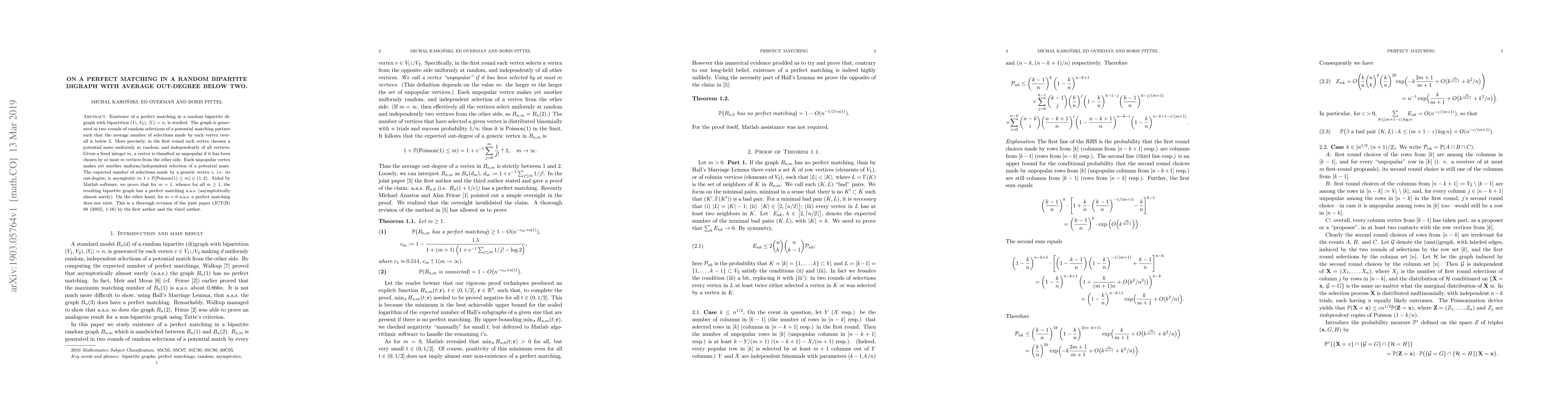 This paper studies the existence of perfect matching in random bipartite digraphs with average out-degree below two. Through a two-round selection process, it's proven via Matlab simulations that for any fixed m, a perfect matching asymptotically almost surely exists when m ≥ 1. Conversely, for m = 0, a perfect matching a.a.s. does not exist, leaving a giant component of size 2n - O(n^1/2) and smaller components of O(log n). This revises previous work in JCT(B) 88 (2003).