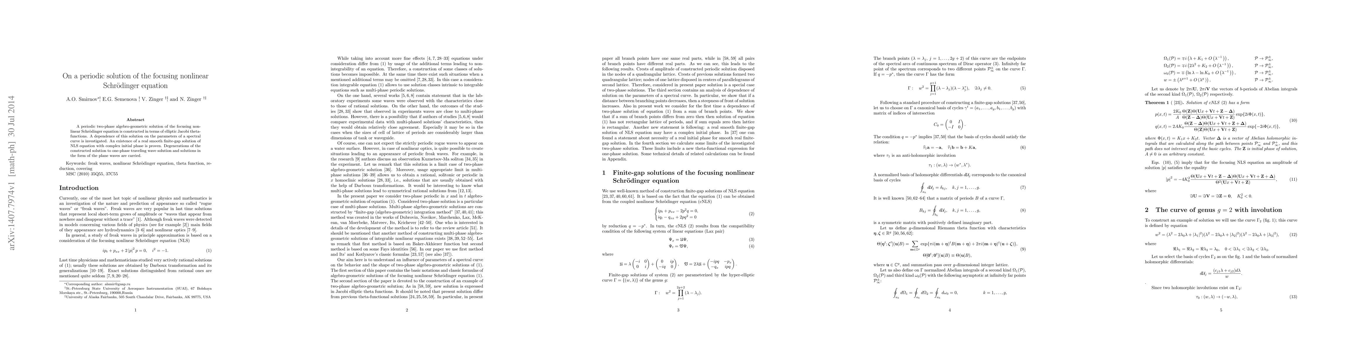 This paper constructs a periodic two-phase algebro-geometric solution for the focusing nonlinear Schrödinger equation using elliptic Jacobi theta-functions, investigates its dependence on spectral parameters, and proves the existence of a real smooth finite-gap solution with complex initial phase. The study also explores the degenerations of the solution into one-phase traveling waves and plane wave forms.