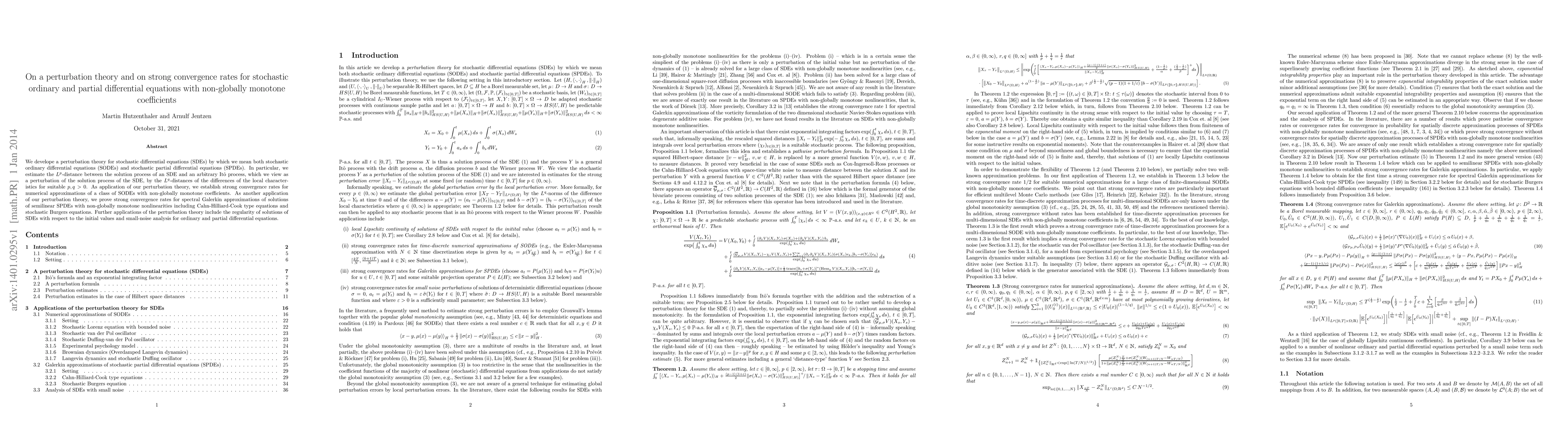 We develope a perturbation theory for stochastic differential equations (SDEs) by which we mean both stochastic ordinary differential equations (SODEs) and stochastic partial differential equations (SPDEs). In particular, we estimate the $ L^p $-distance between the solution process of an SDE and an arbitrary It\^o process, which we view as a perturbation of the solution process of the SDE, by the $ L^q $-distances of the differences of the local characteristics for suitable $ p, q > 0 $. As application of our perturbation theory, we establish strong convergence rates for numerical approximations of a class of SODEs with non-globally monotone coefficients. As another application of our perturbation theory, we prove strong convergence rates for spectral Galerkin approximations of solutions of semilinear SPDEs with non-globally monotone nonlinearities including Cahn-Hilliard-Cook type equations and stochastic Burgers equations. Further applications of the perturbation theory include the regularity of solutions of SDEs with respect to the initial values and small-noise analysis for ordinary and partial differential equations.