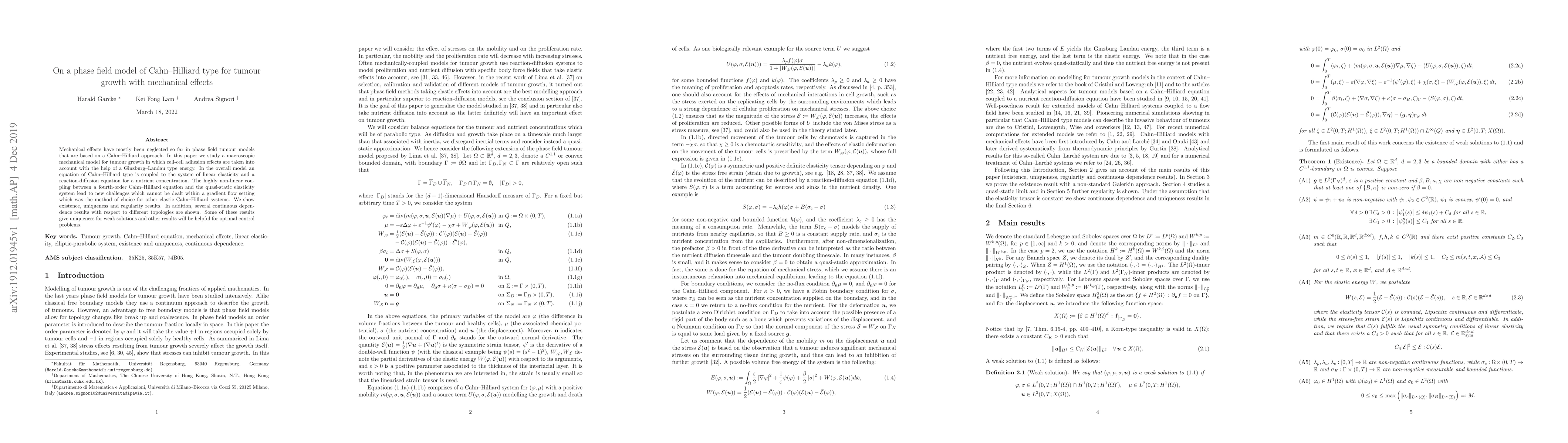 This paper develops a phase field model of Cahn-Hilliard type for tumour growth, incorporating mechanical effects through a Ginzburg-Landau energy and coupling it with linear elasticity and nutrient diffusion. It establishes existence, uniqueness, and regularity results for the model, addressing challenges from the non-linear coupling.