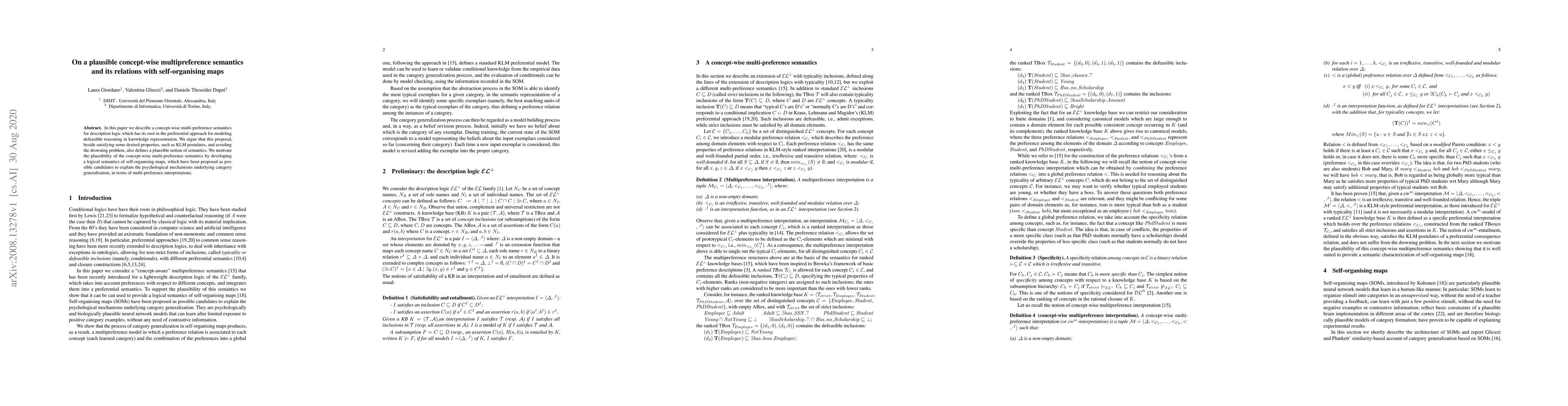 Inthispaperwedescribeaconcept-wisemulti-preferencesemantics for description logic which has its root in the preferential approach for modeling defeasible reasoning in knowledge representation. We argue that this proposal, beside satisfying some desired properties, such as KLM postulates, and avoiding the drowning problem, also defines a plausible notion of semantics. We motivate the plausibility of the concept-wise multi-preference semantics by developing a logical semantics of self-organising maps, which have been proposed as possible candidates to explain the psychological mechanisms underlying category generalisation, in terms of multi-preference interpretations.