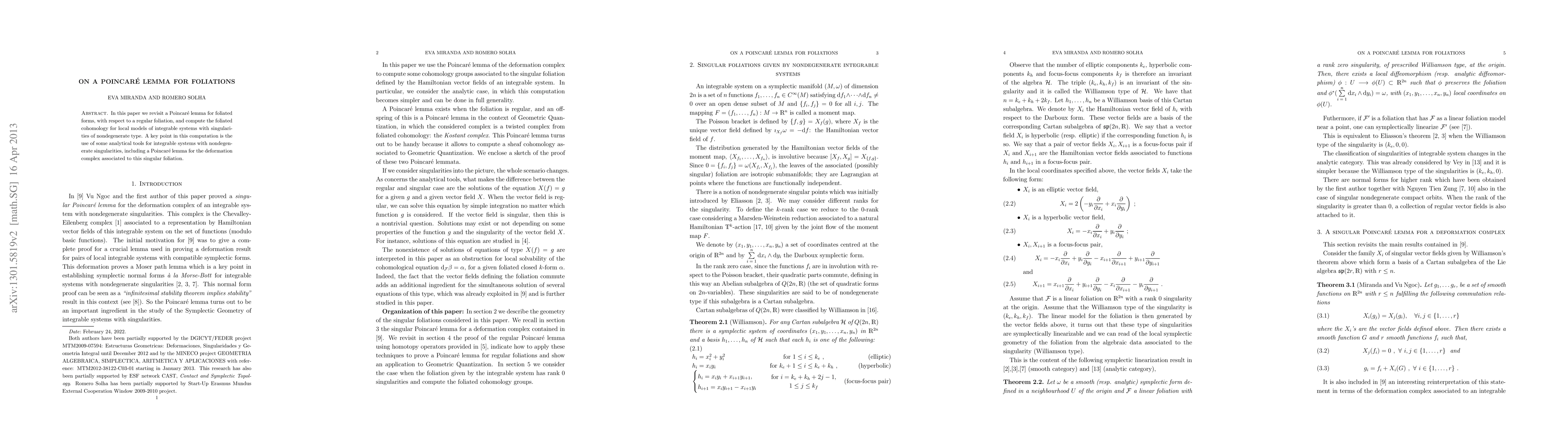 This paper explores a Poincare lemma for foliated forms concerning regular foliations and calculates foliated cohomology for local models of integrable systems with nondegenerate singularities, employing analytical tools for such systems.