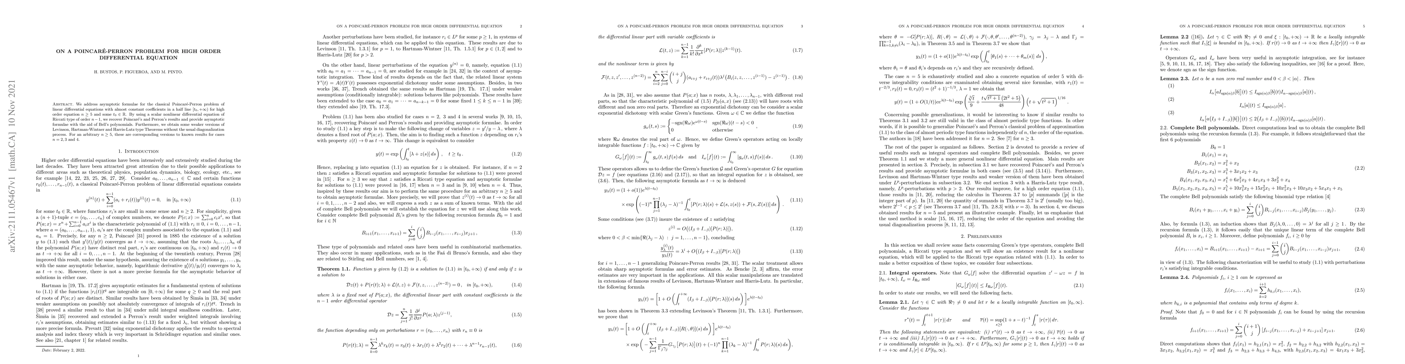 We address asymptotic formulae for the classical Poincar\'e-Perron problem of linear differential equations with almost constant coefficients in a half line $[t_0,+\infty)$ for high order equation $n\ge 5$ and some $t_0\in\mathbb{R}$. By using a scalar nonlinear differential equation of Riccati type of order $n-1$, we recover Poincar\'e's and Perron's results and provide asymptotic formulae with the aid of Bell's polynomials. Furthermore, we obtain some weaker versions of Levinson, Hartman-Wintner and Harris-Lutz type Theorems without the usual diagonalization process. For an arbitrary $n\ge 5$, these are corresponding versions to known results for cases $n=2,3$ and $4$.