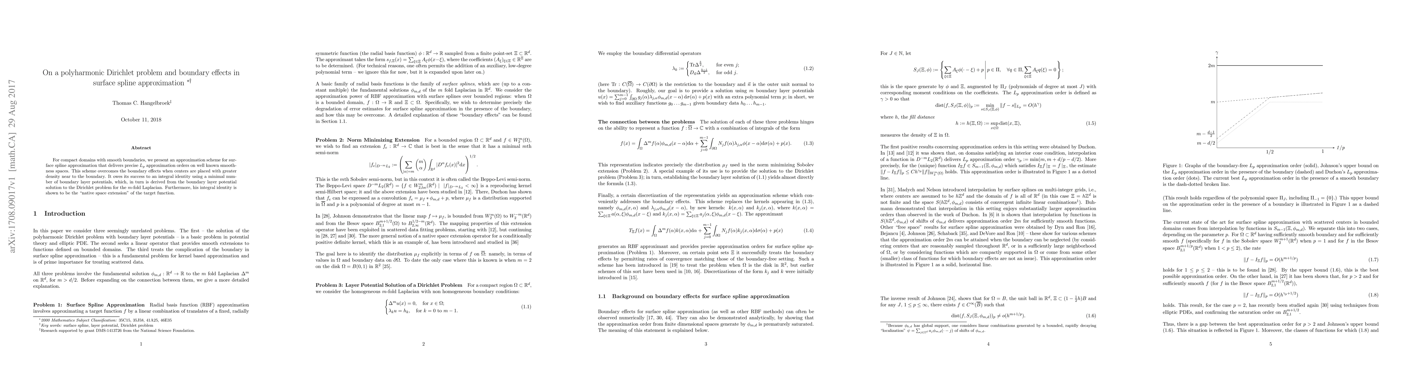 For compact domains with smooth boundaries, we present an approximation scheme for surface spline approximation that delivers precise $L_p$ approximation orders on well known smoothness spaces. This scheme overcomes the boundary effects when centers are placed with greater density near to the boundary. It owes its success to an integral identity using a minimal number of boundary layer potentials, which, in turn is derived from the boundary layer potential solution to the Dirichlet problem for the $m$-fold Laplacian. Furthermore, his integral identity is shown to be the "native space extension" of the target function.