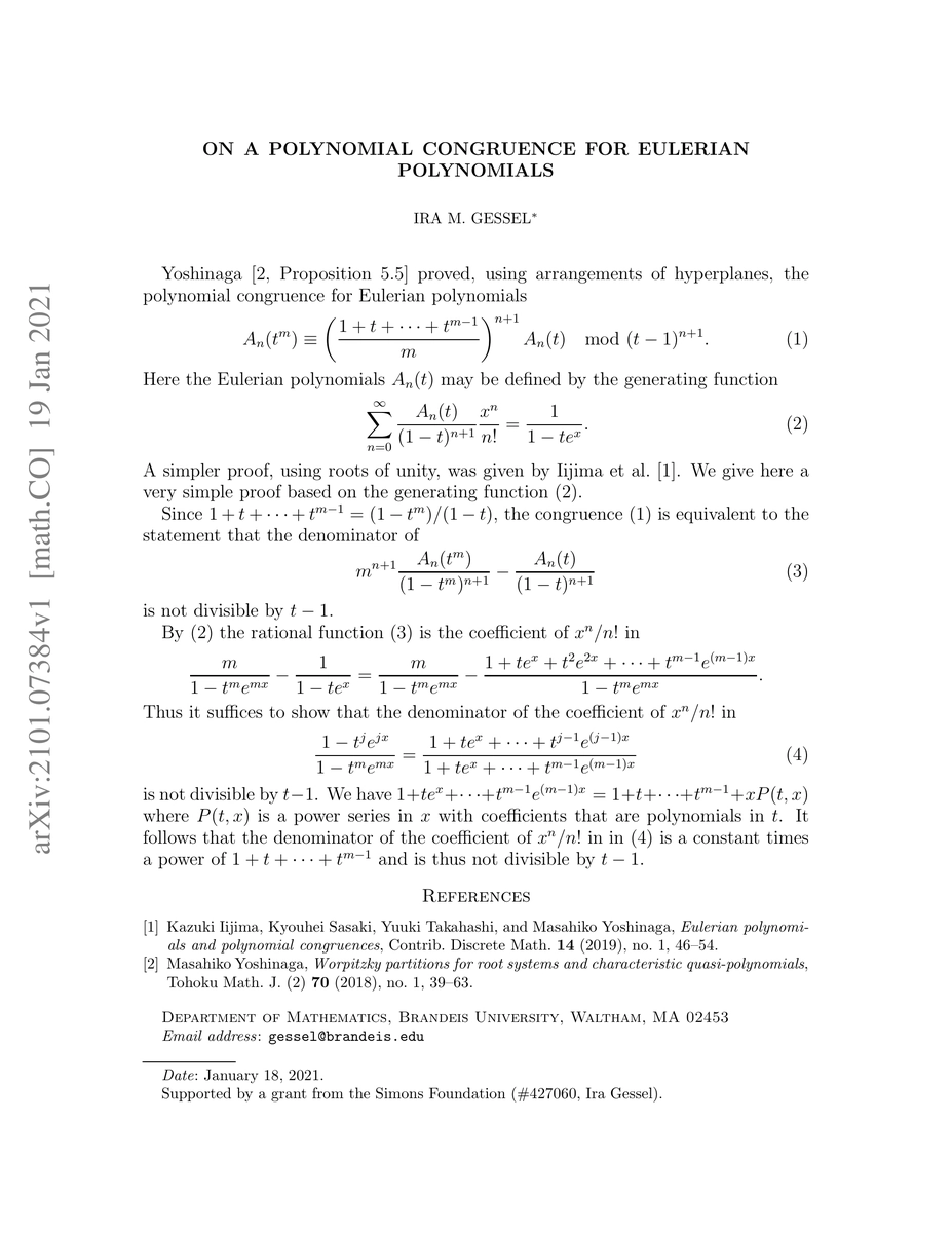 Summary: This paper presents a concise proof of a polynomial congruence for Eulerian polynomials using generating functions, building on previous proofs established via hyperplane arrangements and roots of unity by Yoshinaga and others.