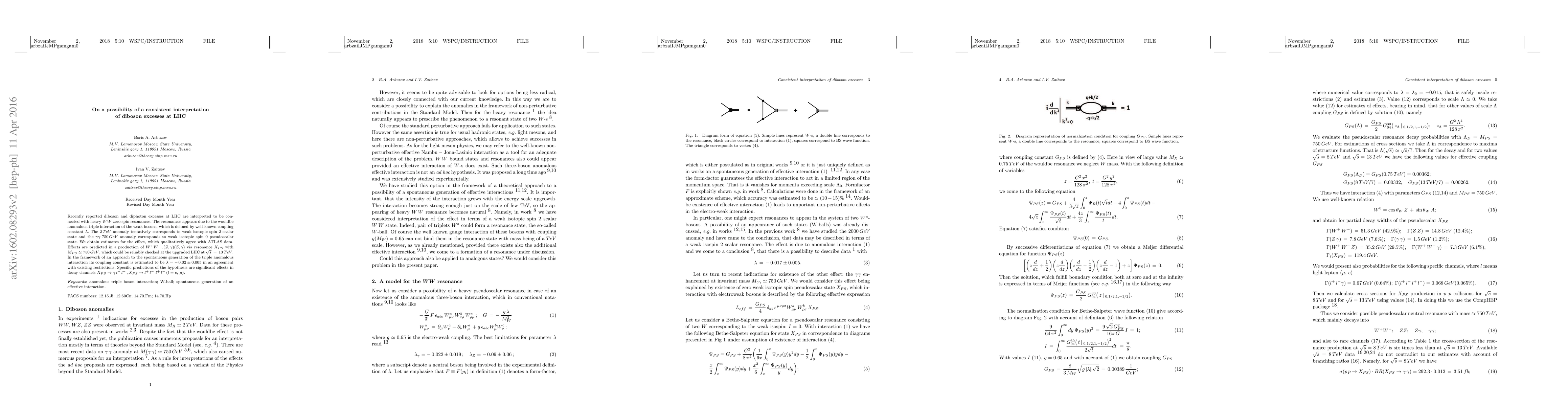 Recently reported diboson and diphoton excesses at LHC are interpreted to be connected with heavy $WW$ zero spin resonances. The resonances appears due to the wouldbe anomalous triple interaction of the weak bosons, which is defined by well-known coupling constant $\lambda$. The $2\, TeV$ anomaly tentatively corresponds to weak isotopic spin 2 scalar state and the $\gamma\gamma\,\,750\, GeV$ anomaly corresponds to weak isotopic spin 0 pseudoscalar state. We obtain estimates for the effect, which qualitatively agree with ATLAS data. Effects are predicted in a production of $W^+ W^-, (Z,\gamma) (Z,\gamma)$ via resonance $X_{PS}$ with $M_{PS} \simeq 750\,GeV$, which could be reliably checked at the upgraded LHC at $\sqrt{s}\,=\,13\, TeV$. In the framework of an approach to the spontaneous generation of the triple anomalous interaction its coupling constant is estimated to be $\lambda = -\,0.02\pm 0.005$ in an agreement with existing restrictions. Specific predictions of the hypothesis are significant effects in decay channels $X_{PS} \to \gamma\,l^+\,l^-\,, X_{PS} \to l^+\,l^-\,\,l^+\,l^-\,(l = e,\,\mu)$.