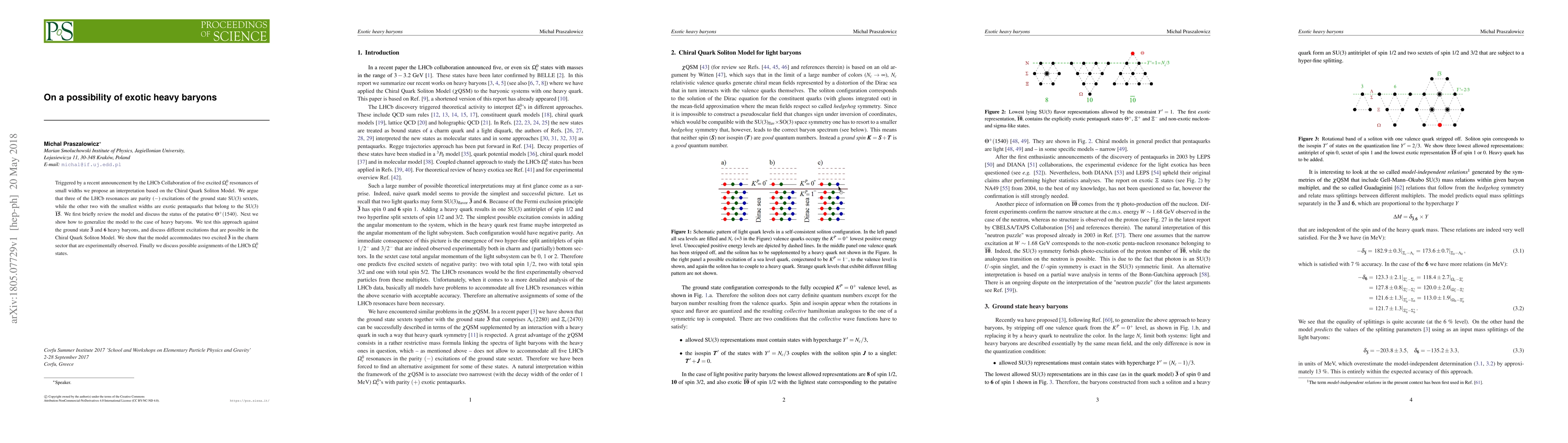 Triggered by a recent announcement by the LHCb Collaboration of five excited $\Omega^0_c$ resonances of small widths we propose an interpretation based on the Chiral Quark Soliton Model. We argue that three of the LHCb resonances are parity ($-$) excitations of the ground state SU(3) sextets, while the other two with the smallest widths are exotic pentaquarks that belong to the SU(3) $\overline{\mathbf{15}}$. We first briefly review the model and discuss the status of the putative $\Theta^+(1540)$. Next we show how to generalize the model to the case of heavy baryons. We test this approach against the ground state $\overline{\mathbf{3}}$ and ${\mathbf{6}}$ heavy baryons, and discuss different excitations that are possible in the Chiral Quark Soliton Model. We show that the model accommodates two excited $\overline{\mathbf{3}}$ in the charm sector that are experimentally observed. Finally we discuss possible assignments of the LHCb $\Omega^0_c$ states.