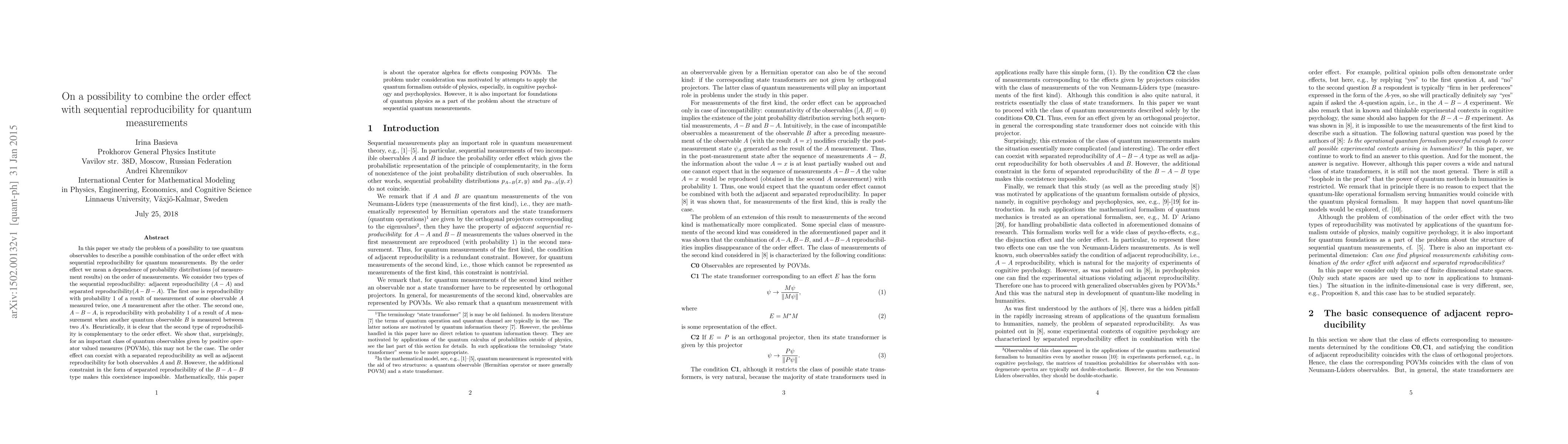 In this paper we study the problem of a possibility to use quantum observables to describe a possible combination of the order effect with sequential reproducibility for quantum measurements. By the order effect we mean a dependence of probability distributions (of measurement results) on the order of measurements. We consider two types of the sequential reproducibility: adjacent reproducibility ($A-A$) and separated reproducibility($A-B-A$). The first one is reproducibility with probability 1 of a result of measurement of some observable $A$ measured twice, one $A$ measurement after the other. The second one, $A-B-A$, is reproducibility with probability 1 of a result of $A$ measurement when another quantum observable $B$ is measured between two $A$'s. Heuristically, it is clear that the second type of reproducibility is complementary to the order effect. We show that, surprisingly, for an important class of quantum observables given by positive operator valued measures (POVMs), this may not be the case. The order effect can coexist with a separated reproducibility as well as adjacent reproducibility for both observables $A$ and $B.$ However, the additional constraint in the form of separated reproducibility of the $B-A-B$ type makes this coexistence impossible. Mathematically, this paper is about the operator algebra for effects composing POVMs. The problem under consideration was motivated by attempts to apply the quantum formalism outside of physics, especially, in cognitive psychology and psychophysics. However, it is also important for foundations of quantum physics as a part of the problem about the structure of sequential quantum measurements.