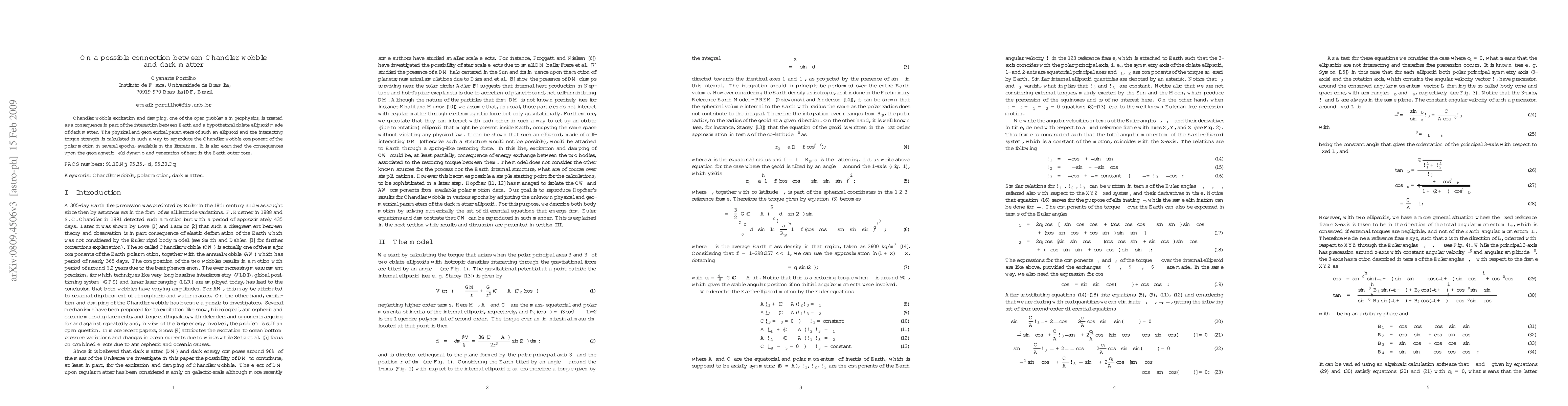 Chandler wobble excitation and damping, one of the open problems in geophysics, is treated as a consequence in part of the interaction between Earth and a hypothetical oblate ellipsoid made of dark matter. The physical and geometrical parameters of such an ellipsoid and the interacting torque strength is calculated in such a way to reproduce the Chandler wobble component of the polar motion in several epochs, available in the literature. It is also examined the consequences upon the geomagnetic field dynamo and generation of heat in the Earth outer core.
