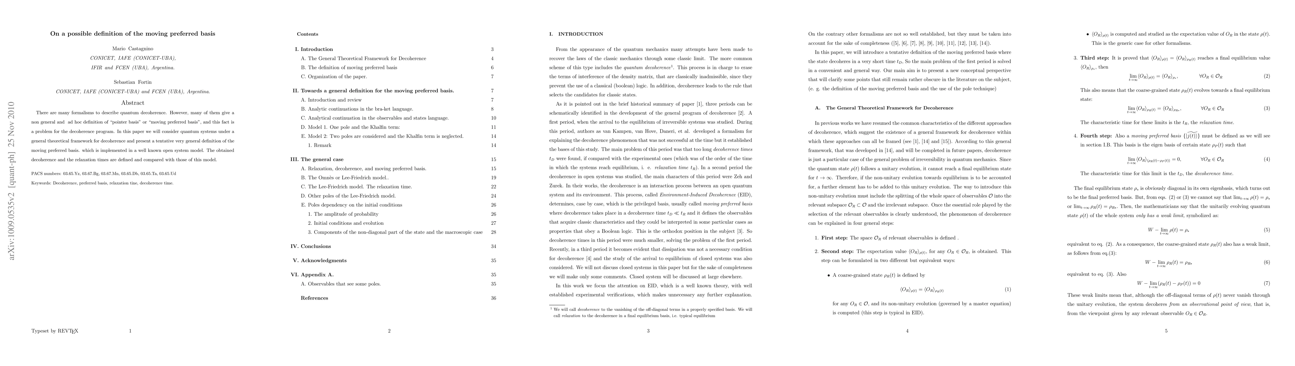 There are many formalisms to describe quantum decoherence. However, many of them give a non general and ad hoc definition of "pointer basis" or "moving preferred basis", and this fact is a problem for the decoherence program. In this paper we will consider quantum systems under a general theoretical framework for decoherence and present a tentative very general definition of the moving preferred basis. which is implemented in a well known open system model. The obtained decoherence and the relaxation times are defined and compared with those of this model.