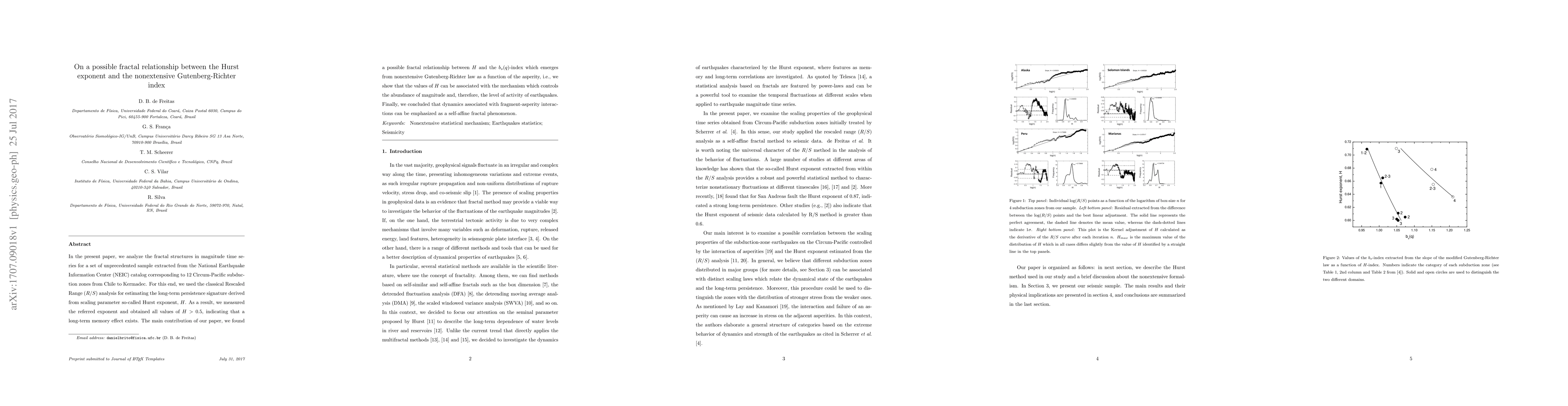 This paper investigates the fractal structures in earthquake magnitude time series from 12 Circum-Pacific subduction zones using Rescaled Range analysis to estimate the Hurst exponent. It reveals a potential fractal relationship between the Hurst exponent and the nonextensive Gutenberg-Richter index, suggesting that the dynamics of earthquake activity are influenced by self-affine fractal phenomena.