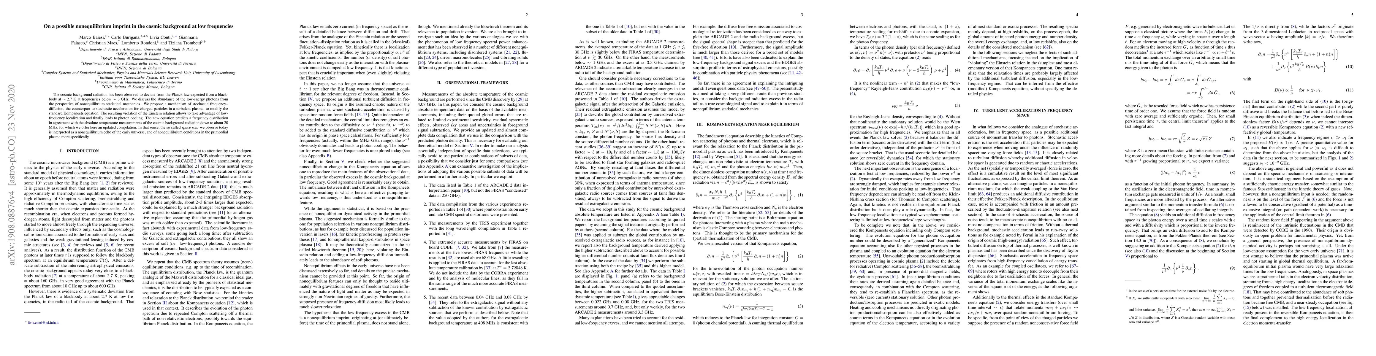 The cosmic background radiation has been observed to deviate from the Planck law expected from a blackbody at $\sim$ 2.7 K at frequencies below $\sim 3$ GHz. We discuss the abundance of the low-energy photons from the perspective of nonequilibrium statistical mechanics. We propose a mechanism of stochastic frequency-diffusion, the counterpart to stochastic acceleration for charged particles in a turbulent plasma, to modify the standard Kompaneets equation. The resulting violation of the Einstein relation allows to take advantage of low-frequency localization and finally leads to photon cooling. The new equation predicts a frequency distribution in agreement with the absolute temperature measurements of the cosmic background radiation down to about 20 MHz, for which we offer here an updated compilation. In that sense, the so called 'space roar' we observe today is interpreted as a nonequilibrium echo of the early universe, and of nonequilibrium conditions in the primordial plasma more specifically.