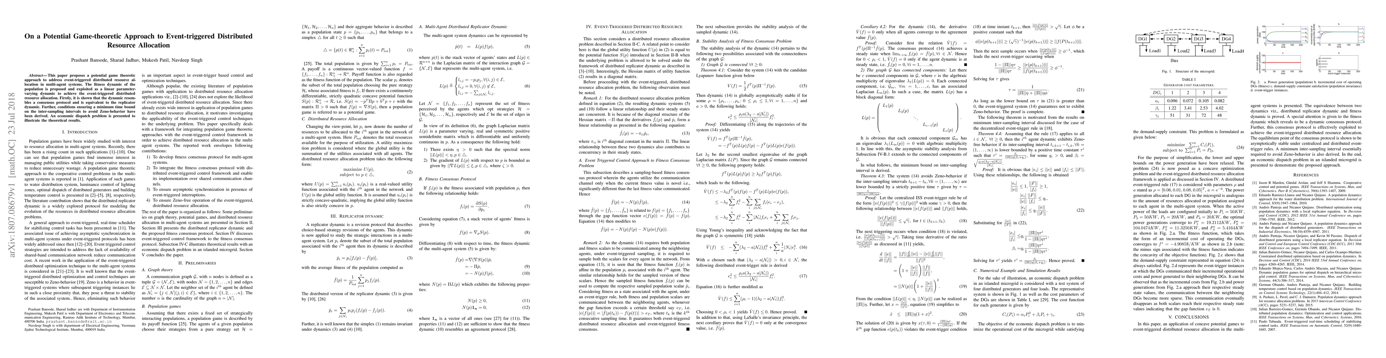 This paper proposes a potential game theoretic approach to address event-triggered distributed resource allocation in multi-agent systems. The fitness dynamic of the population is proposed and exploited as a linear parametervarying dynamic to achieve the event-triggered distributed resource allocation. Firstly, it is shown that the dynamic resembles a consensus protocol and is equivalent to the replicator dynamic. Further, conditions ensuring a minimum time bound on the inter-sampling intervals to avoid Zeno-behavior have been derived. An economic dispatch problem is presented to illustrate the theoretical results.