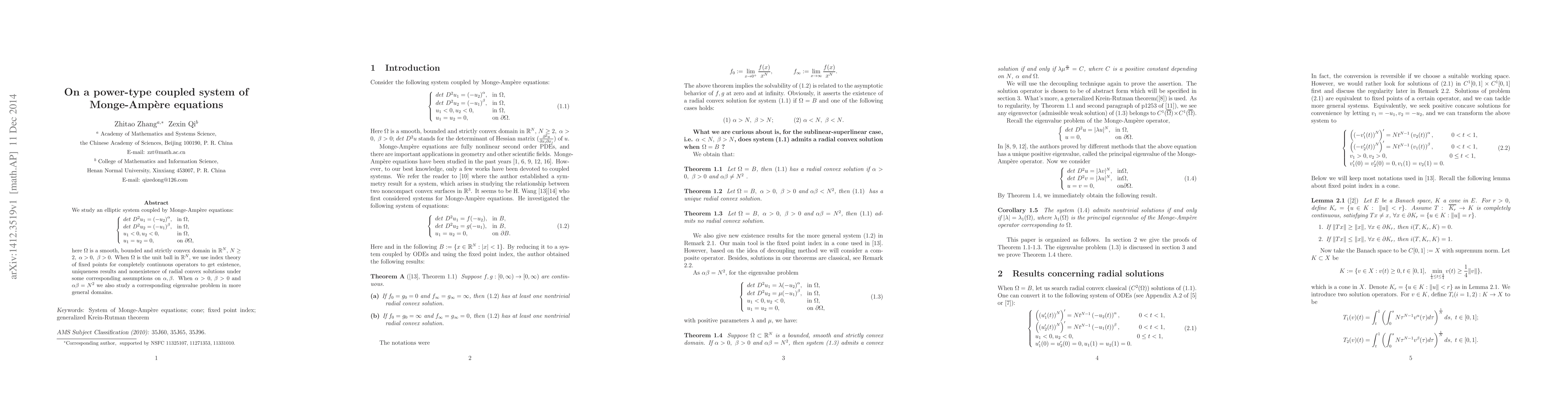 We study an elliptic system coupled by Monge-Amp\`{e}re equations: \begin{center} $\left\{ \begin{array}{ll} det~D^{2}u_{1}={(-u_{2})}^\alpha, & \hbox{in $\Omega,$} det~D^{2}u_{2}={(-u_{1})}^\beta, & \hbox{in $\Omega,$} u_{1}<0, u_{2}<0,& \hbox{in $\Omega,$} u_{1}=u_{2}=0, & \hbox{on $ \partial \Omega,$} \end{array} \right.$ \end{center} here $\Omega$~is a smooth, bounded and strictly convex domain in~$\mathbb{R}^{N}$,~$N\geq2,~\alpha >0,~\beta >0$. When $\Omega$ is the unit ball in $\mathbb{R}^{N}$, we use index theory of fixed points for completely continuous operators to get existence, uniqueness results and nonexistence of radial convex solutions under some corresponding assumptions on $\alpha,\beta$. When $\alpha>0$, $\beta>0$ and $\alpha\beta=N^2$ we also study a corresponding eigenvalue problem in more general domains.