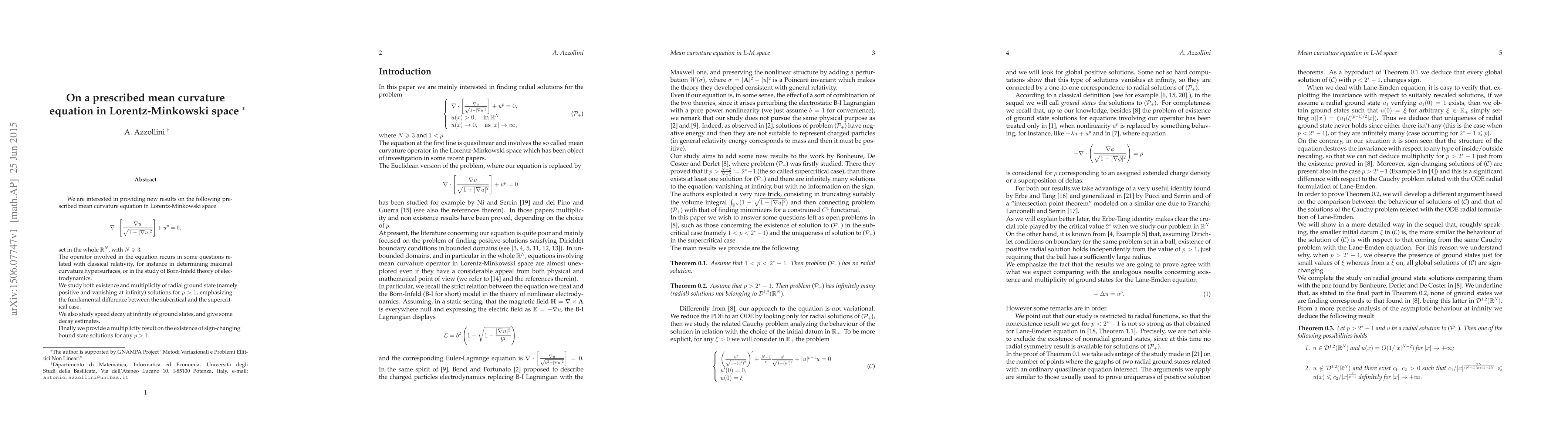 We are interested in providing new results on a prescribed mean curvature equation in Lorentz-Minkowski space set in the whole R^N, with N >2. We study both existence and multiplicity of radial ground state solutions for p>1, emphasizing the fundamental difference between the subcritical and the supercritical case. We also study speed decay at infinity of ground states, and give some decay estimates. Finally we provide a multiplicity result on the existence of sign-changing bound state solutions for any p>1.