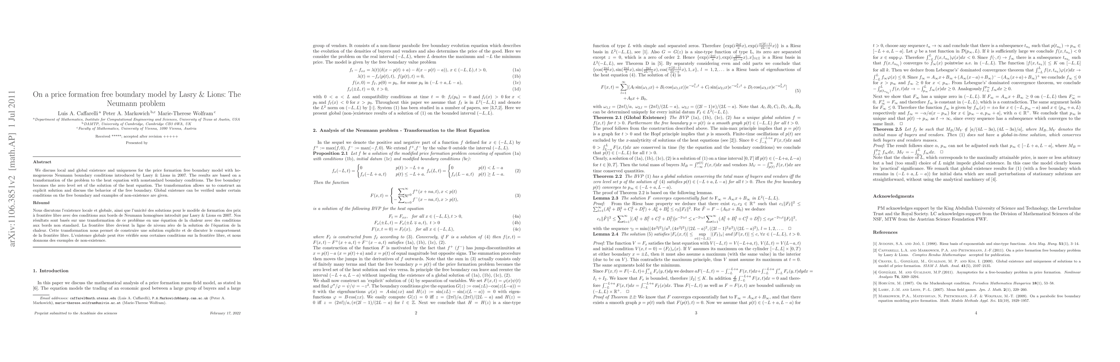 We discuss local and global existence and uniqueness for the price formation free boundary model with homogeneous Neumann boundary conditions introduced by Lasry & Lions in 2007. The results are based on a transformation of the problem to the heat equation with nonstandard boundary conditions. The free boundary becomes the zero level set of the solution of the heat equation. The transformation allows us to construct an explicit solution and discuss the behavior of the free boundary. Global existence can be verified under certain conditions on the free boundary and examples of non-existence are given.
