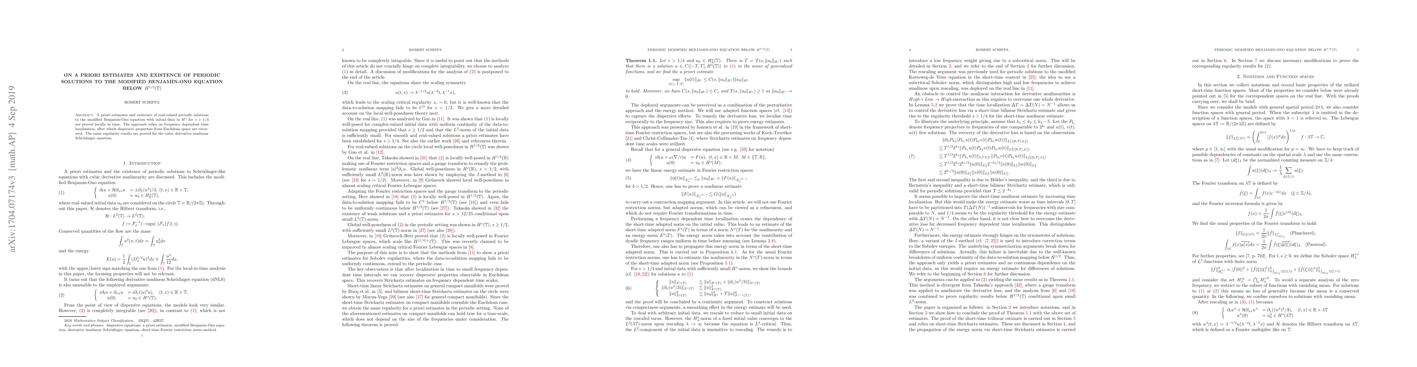 This paper proves a priori estimates and existence of periodic solutions for the modified Benjamin-Ono equation with initial data in $H^s$ for $s > 1/4$, using frequency-dependent time localization and recovering dispersive properties. Similar results are obtained for the cubic derivative nonlinear Schrödinger equation.