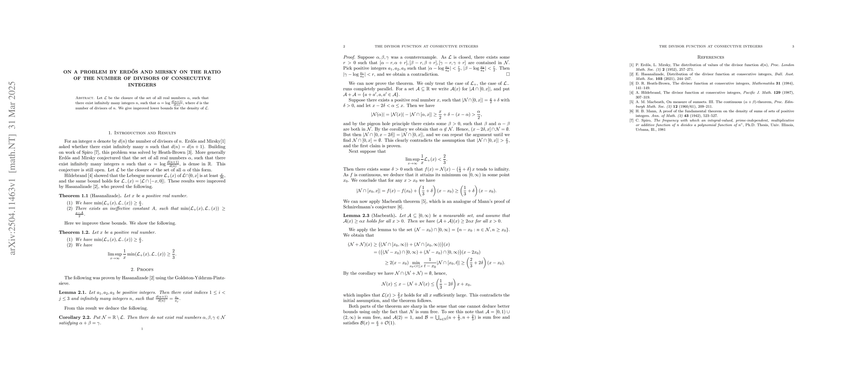 The paper focuses on improving lower bounds for the density of the closure $\mathcal{L}$ of real numbers $\alpha$ for which there exist infinitely many integers $n$ such that $\alpha = \log\frac{d(n+1)}{d(n)}$, with $d$ being the number of divisors of $n.