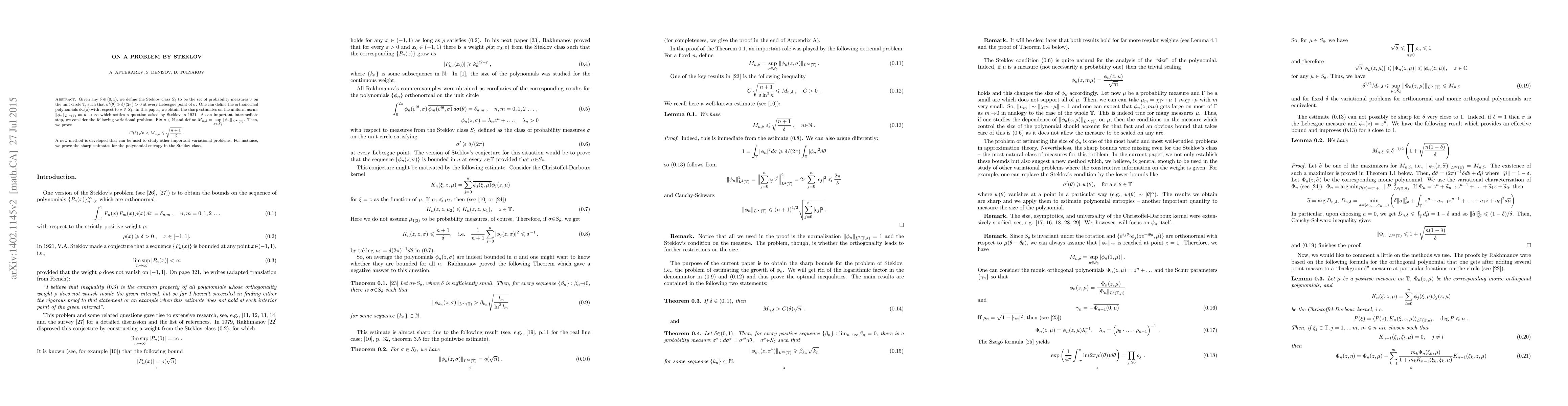 This paper provides sharp estimates on the uniform norm growth of orthonormal polynomials for measures meeting the Steklov condition, surpassing previous results by Rakhmanov and conclusively resolving Steklov's problem. Additionally, it achieves sharp estimates for polynomial entropy within the Steklov class.
