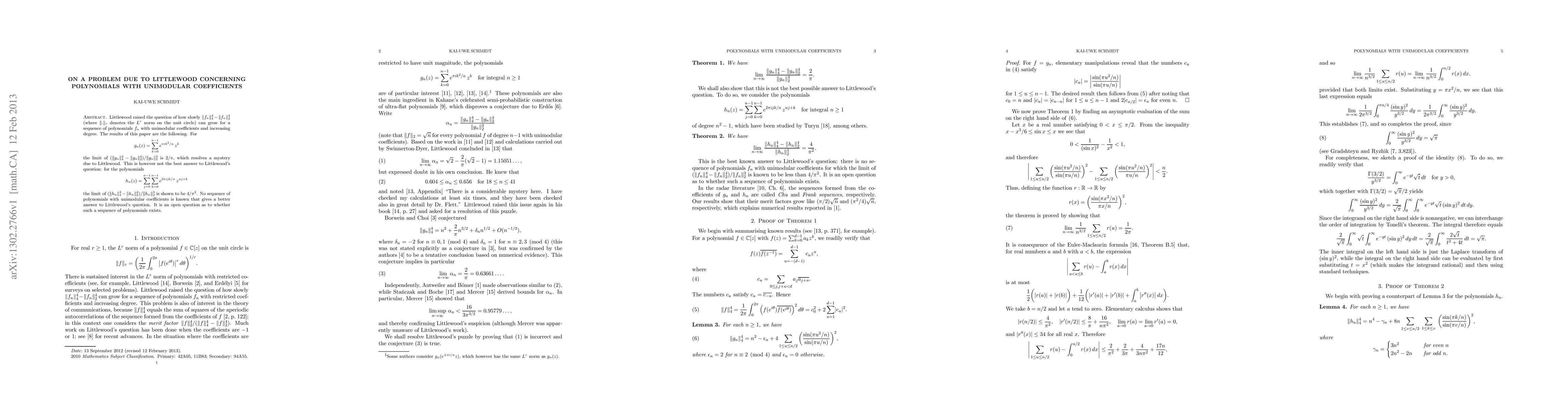 Littlewood raised the question of how slowly ||f_n||_4^4-||f_n||_2^4 (where ||.||_r denotes the L^r norm on the unit circle) can grow for a sequence of polynomials f_n with unimodular coefficients and increasing degree. The results of this paper are the following. For g_n(z)=\sum_{k=0}^{n-1}e^{\pi ik^2/n} z^k the limit of (||g_n||_4^4-||g_n||_2^4)/||g_n||_2^3 is 2/\pi, which resolves a mystery due to Littlewood. This is however not the best answer to Littlewood's question: for the polynomials h_n(z)=\sum_{j=0}^{n-1}\sum_{k=0}^{n-1} e^{2\pi ijk/n} z^{nj+k} the limit of (||h_n||_4^4-||h_n||_2^4)/||h_n||_2^3 is shown to be 4/\pi^2. No sequence of polynomials with unimodular coefficients is known that gives a better answer to Littlewood's question. It is an open question as to whether such a sequence of polynomials exists.