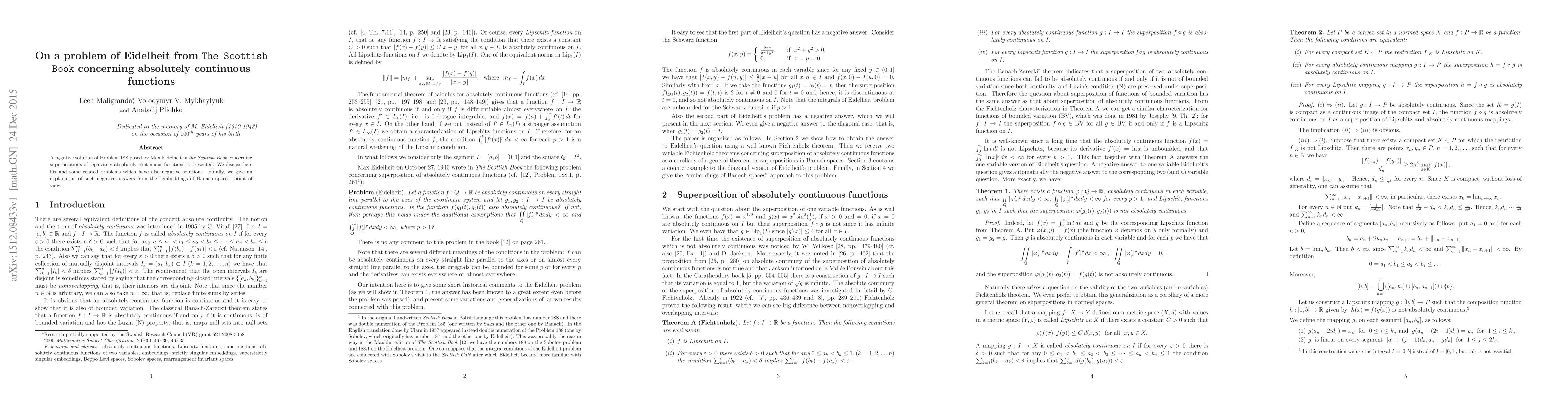 A negative solution of Problem 188 posed by Max Eidelheit in {\it the Scottish Book} concerning superpositions of separately absolutely continuous functions is presented. We discuss here his and some related problems which have also negative solutions. Finally, we give an explanation of such negative answers from the "embeddings of Banach spaces" point of view.