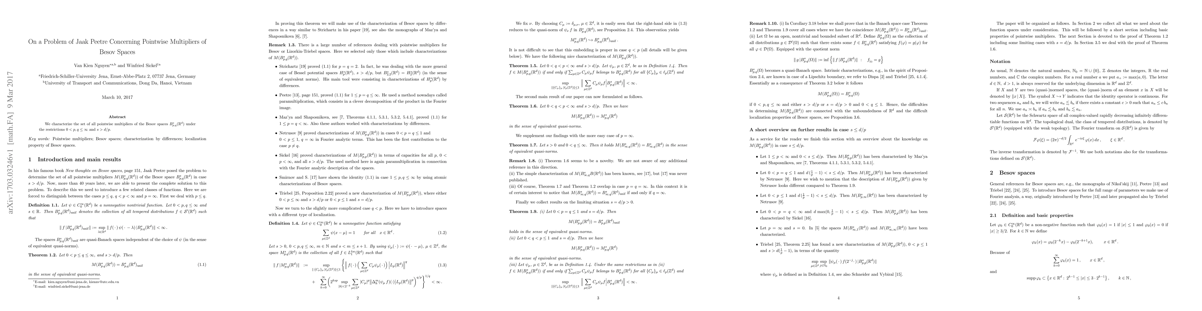 This paper characterizes the set of functions that act as pointwise multipliers for Besov spaces $B^s_{p,q}(\R)$, given the conditions $0 < p,q \le \infty$ and $s > d/p$. The study provides a detailed analysis of these multipliers' properties within the specified parameter constraints.