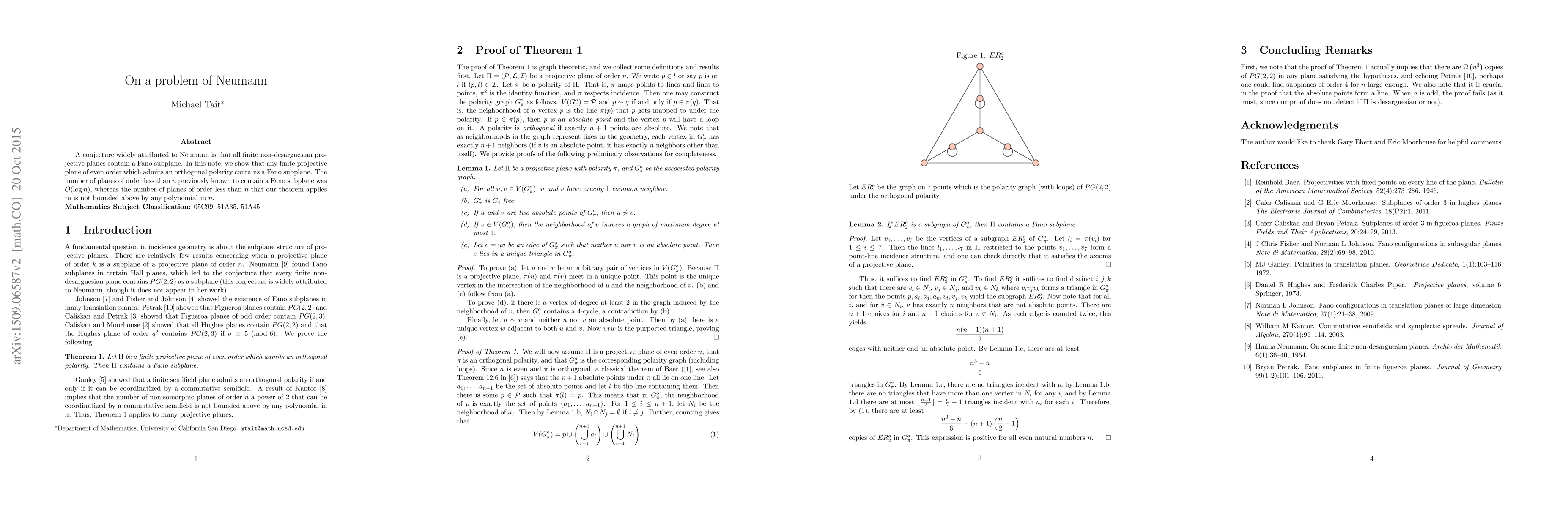 A conjecture widely attributed to Neumann is that all finite non-desarguesian projective planes contain a Fano subplane. In this note, we show that any finite projective plane of even order which admits an orthogonal polarity contains a Fano subplane. The number of planes of order less than $n$ previously known to contain a Fano subplane was $O(\log n)$, whereas the number of planes of order less than $n$ that our theorem applies to is not bounded above by any polynomial in $n$.