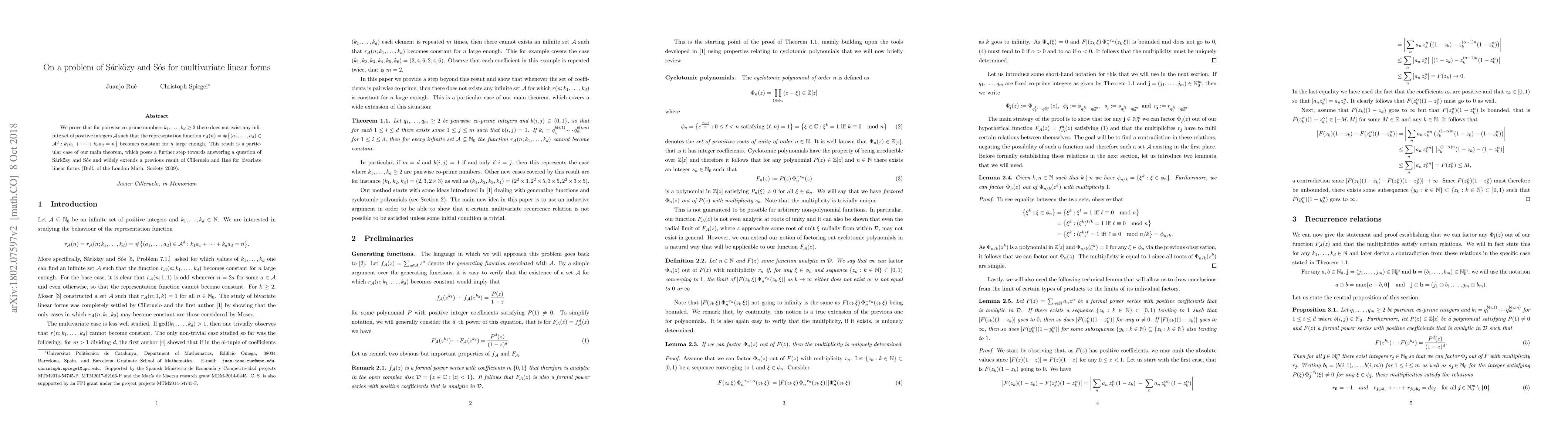 Researchers prove that for large n, pairwise co-prime numbers cannot have a constant representation function for multivariate linear forms, building on previous results and extending them to d variables.