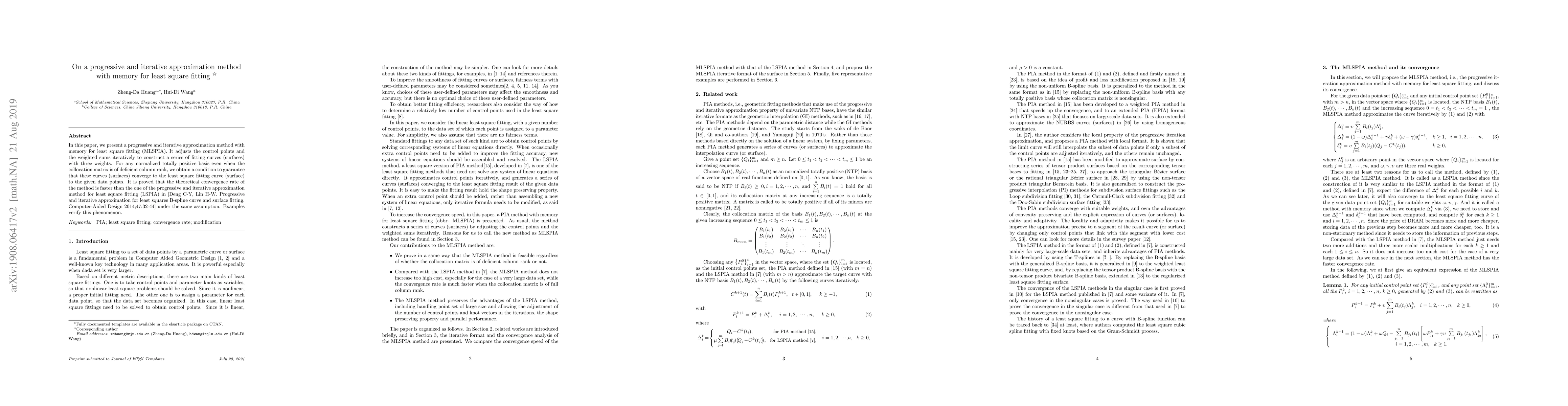 This paper introduces a progressive and iterative approximation method with memory (MLSPIA) for least square fitting, which iteratively adjusts control points and weighted sums to construct fitting curves (surfaces) with three weights. It guarantees convergence to the least square fitting curve (surface) even when the collocation matrix has deficient column rank, and proves a faster theoretical convergence rate compared to existing methods.
