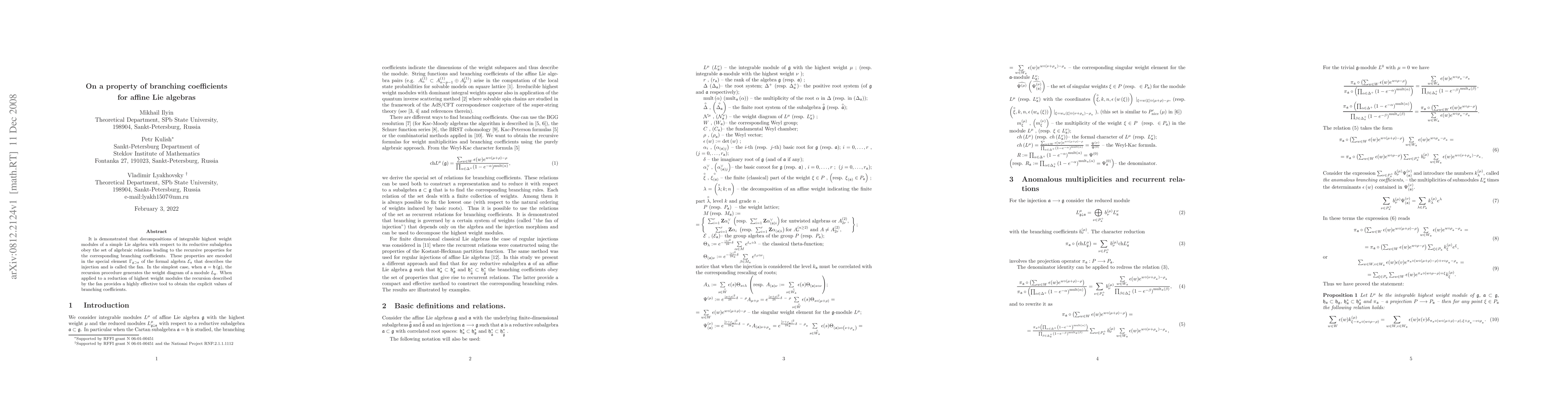 It is demonstrated that decompositions of integrable highest weight modules of a simple Lie algebra with respect to its reductive subalgebra obey the set of algebraic relations leading to the recursive properties for the corresponding branching coefficients. These properties are encoded in the special element (of the formal algebra E(g)) Gamma_(a ->g) that describes the injection and is called the fan. In the simplest case, when "a" is a Cartan subalgebra of g, the recursion procedure generates the weight diagram of the module L(g). When applied to a reduction of highest weight modules the recursion described by the fan provides a highly effective tool to obtain the explicit values of branching coefficients.