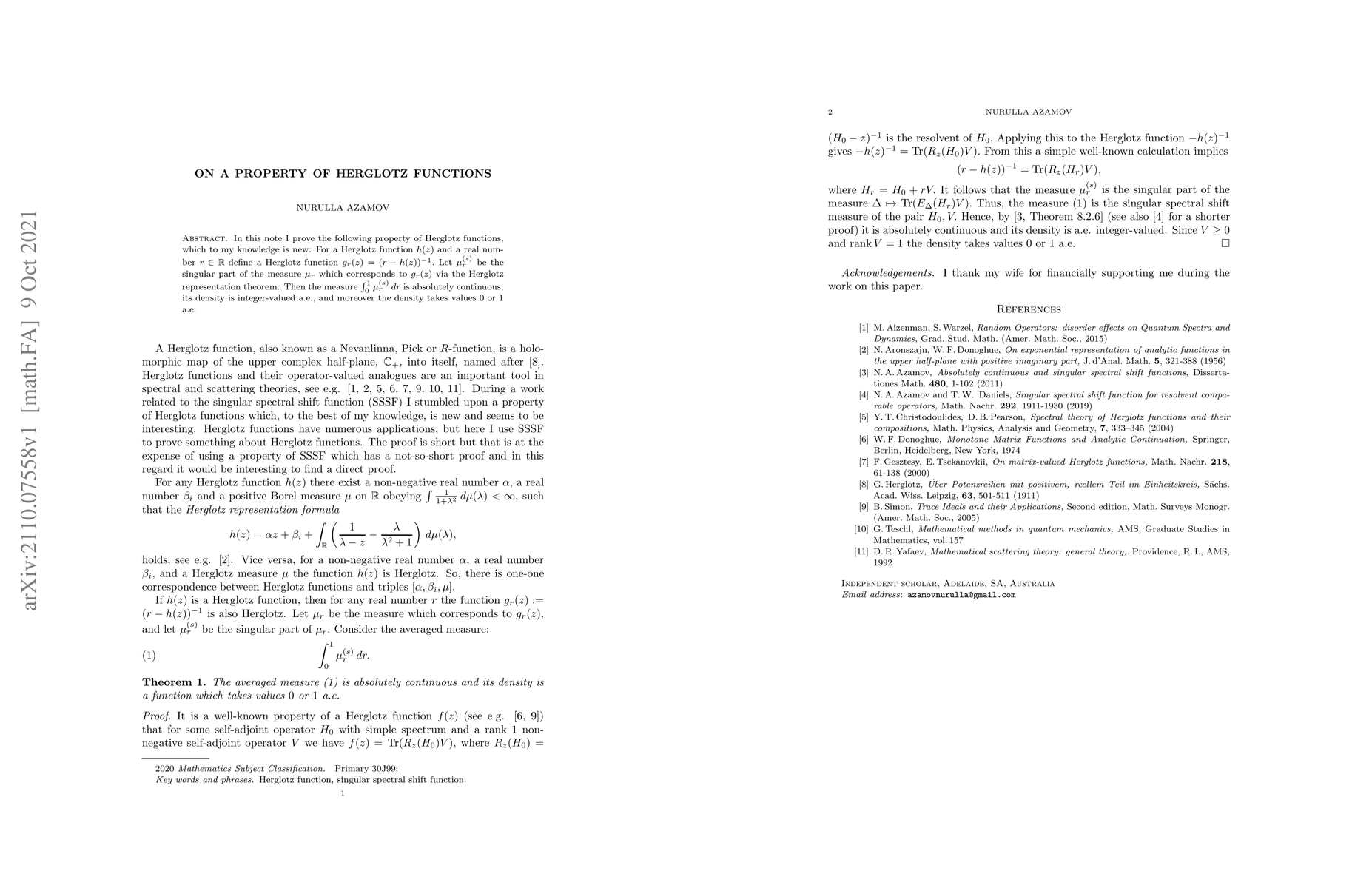 This paper proves a novel property of Herglotz functions: the singular part of the measure corresponding to a modified Herglotz function $g_r(z)$ is such that the integral of this measure over $r$ results in an absolutely continuous measure with integer-valued density, specifically taking values of $0$ or $1$ almost everywhere.