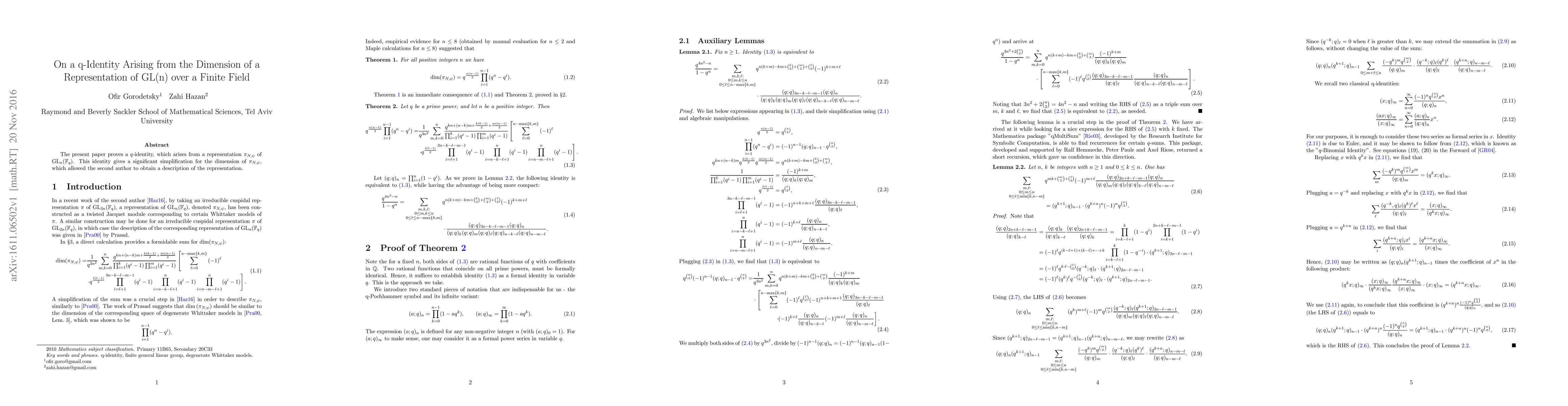The present paper proves a $q$-identity, which arises from a representation $\pi_{N,\psi}$ of $\text{GL}_n(\mathbb{F}_q)$. This identity gives a significant simplification for the dimension of $\pi_{N,\psi}$, which allowed the second author to obtain a description of the representation.