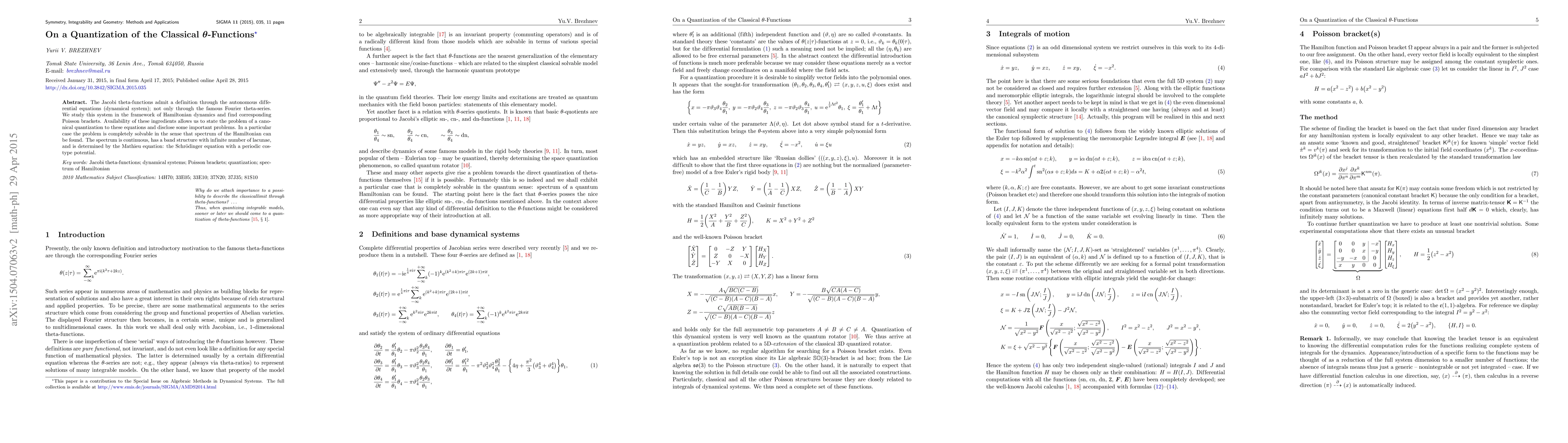 This research quantizes classical Jacobi theta-functions via Hamiltonian dynamics, uncovering Poisson brackets and enabling canonical quantization. The resulting Hamiltonian spectrum is continuous, exhibits a band structure with infinite lacunae, and corresponds to solutions of the Mathieu equation.