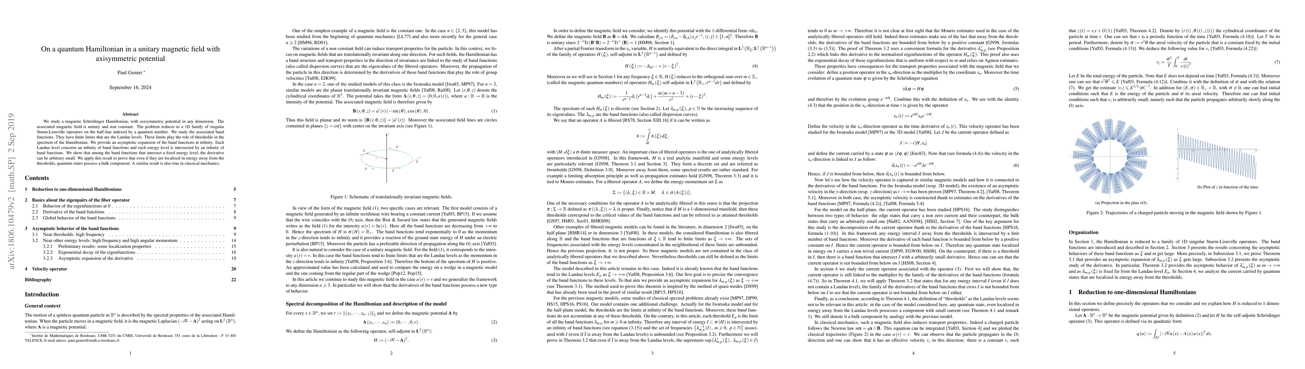 We study a magnetic Schr{\"o}dinger Hamiltonian, with axisymmetric potential in any dimension. The associated magnetic field is unitary and non constant. The problem reduces to a 1D family of singular Sturm-Liouville operators on the half-line indexed by a quantum number. We study the associated band functions. They have finite limits that are the Landau levels. These limits play the role of thresholds in the spectrum of the Hamiltonian. We provide an asymptotic expansion of the band functions at infinity. Each Landau level concerns an infinity of band functions and each energy level is intersected by an infinity of band functions. We show that among the band functions that intersect a fixed energy level, the derivative can be arbitrary small. We apply this result to prove that even if they are localized in energy away from the thresholds, quantum states possess a bulk component. A similar result is also true in classical mechanics.