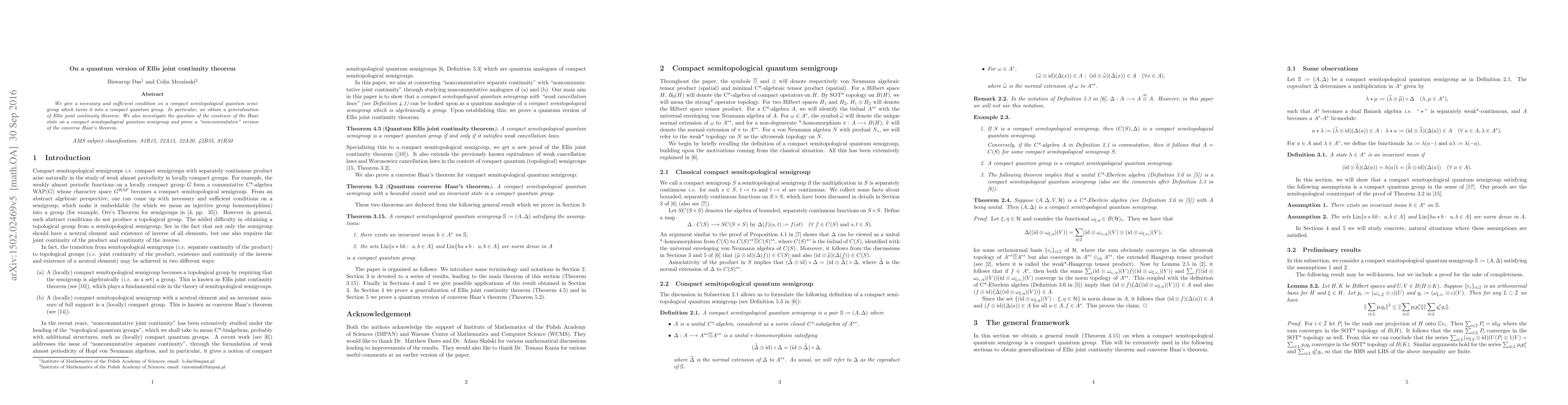 This paper establishes a necessary and sufficient condition for a compact semitopological quantum semigroup to become a compact quantum group, generalizing Ellis's joint continuity theorem. Additionally, it explores the existence of the Haar state and proves a "noncommutative" version of the converse Haar's theorem.