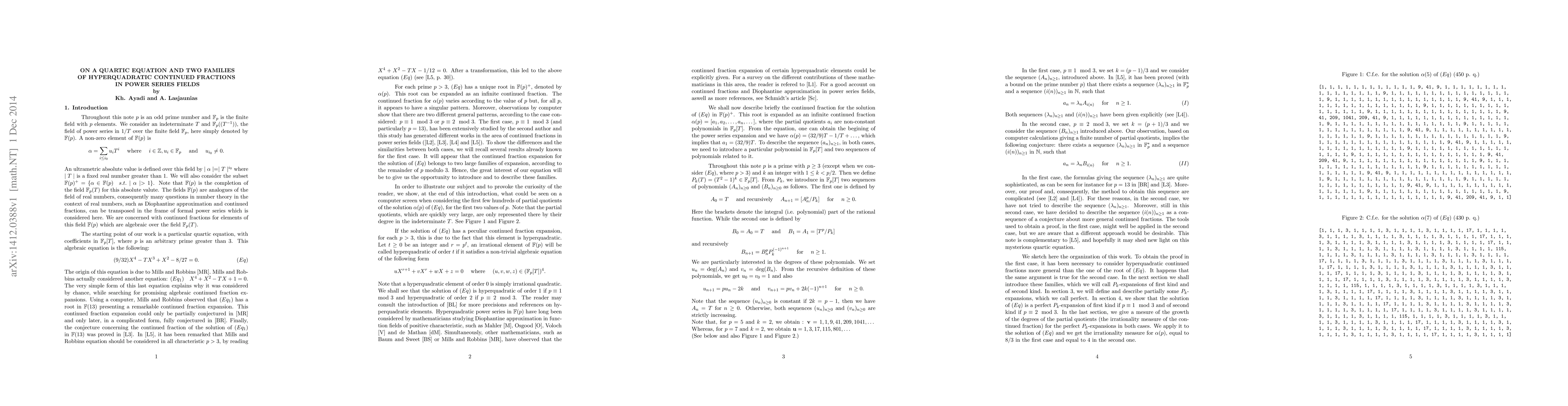 This paper explores a quartic equation over finite fields Fp[T], revealing solutions in power series fields. It identifies two distinct families of hyperquadratic continued fractions based on the prime p modulo 3, leading to different irrationality measures and solution values for the quartic equation.