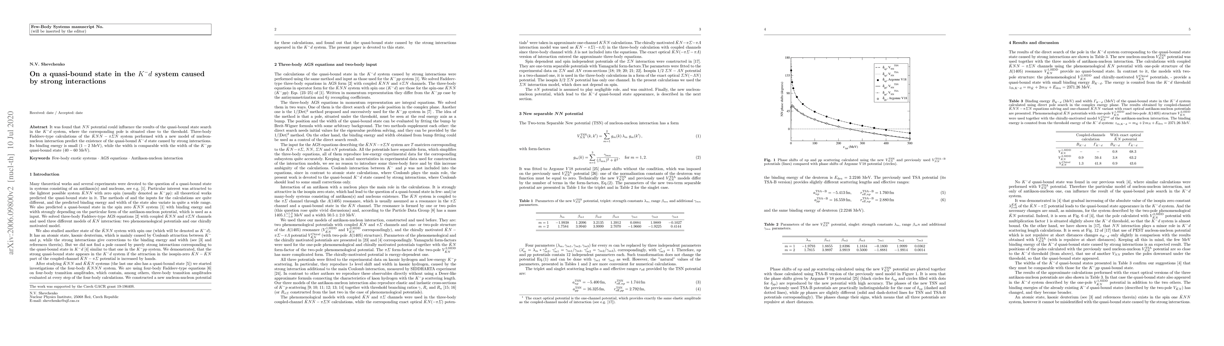 Researchers found a quasi-bound state in the K^- d system caused by strong interactions, with a small binding energy of 1-2 MeV and comparable width to another similar state.