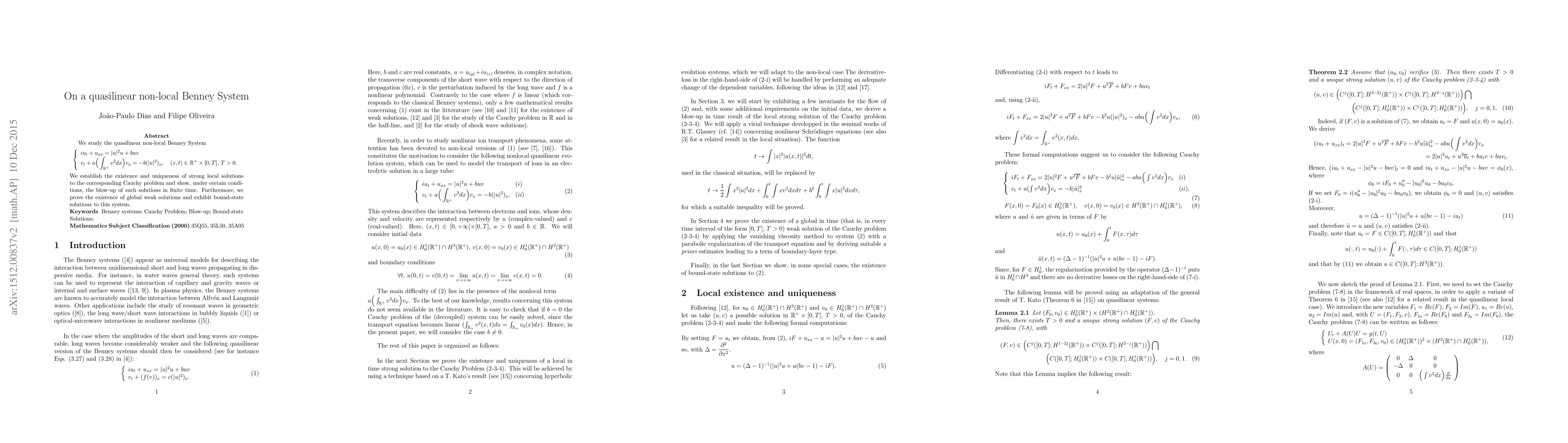 We study the quasilinear non-local Benney System $$\left\{\begin{array}{llll} iu_t+u_{xx}=|u|^2u+buv\\ v_t+a(\int_{\mathbf{R}^+}v^2dx)v_x=-b(|u|^2)_x,\quad (x,t)\in\mathbf{R}^+\times [0,T],\, T>0. \end{array}\right.$$ We establish the existence and uniqueness of strong local solutions to the corresponding Cauchy problem and show, under certain conditions, the blow-up of such solutions in finite time. Furthermore, we prove the existence of global weak solutions and exhibit bound-state solutions to this system.