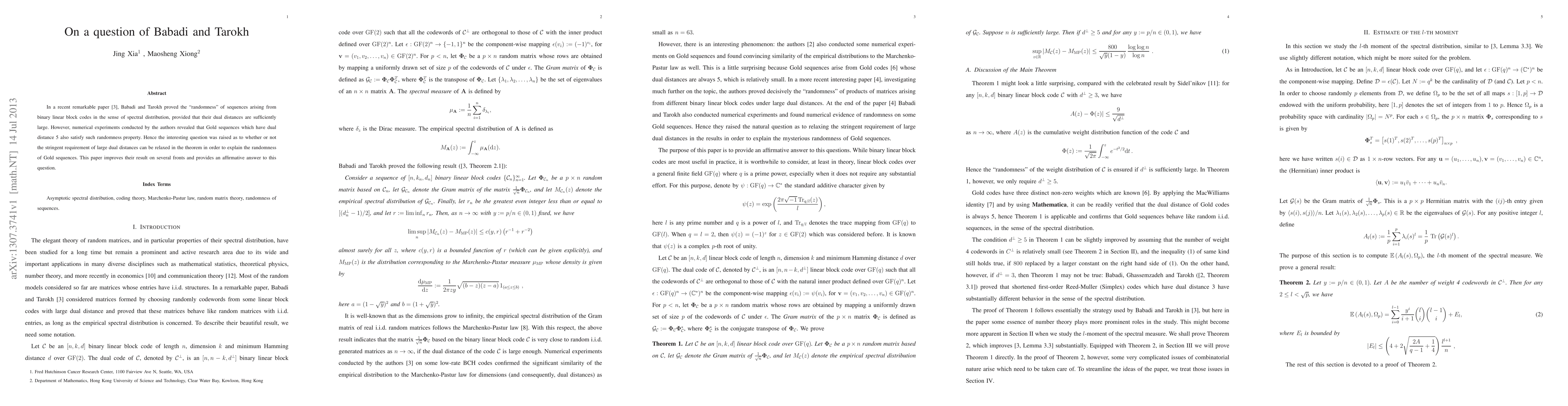 In a recent remarkable paper, Babadi and Tarokh proved the "randomness" of sequences arising from binary linear block codes in the sense of spectral distribution, provided that their dual distances are sufficiently large. However, numerical experiments conducted by the authors revealed that Gold sequences which have dual distance 5 also satisfy such randomness property. Hence the interesting question was raised as to whether or not the stringent requirement of large dual distances can be relaxed in the theorem in order to explain the randomness of Gold sequences. This paper improves their result on several fronts and provides an affirmative answer to this question.
