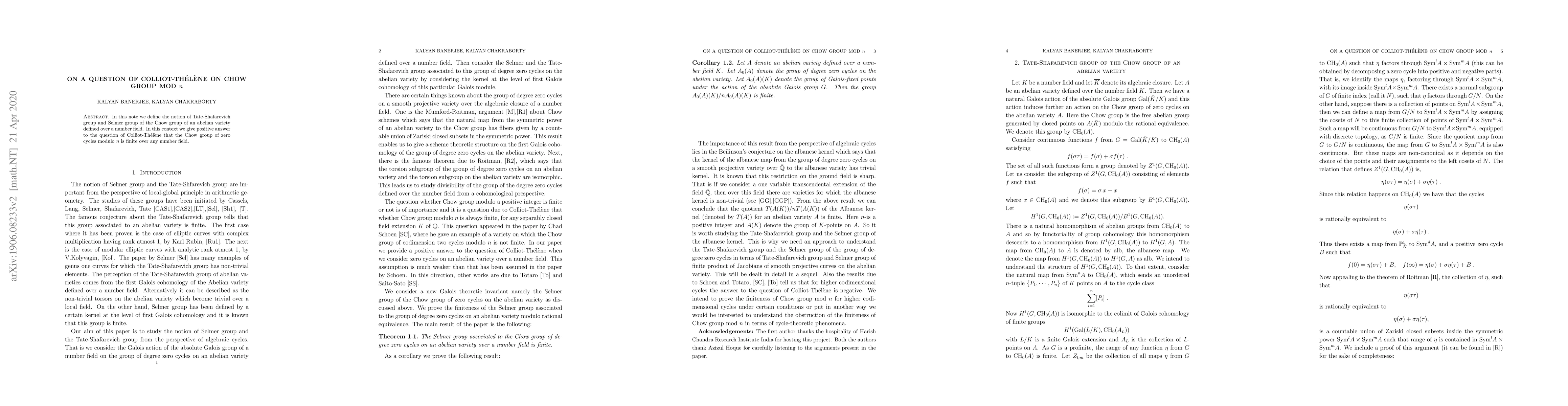In this note we define the notion of Tate-Shafarevich group and Selmer group of the Chow group of an abelian variety defined over a number field. In this context we give positive answer to the question of Colliot-Th\'{e}l\`{e}ne that the Chow group of zero cycles modulo $n$ is finite over any number field.