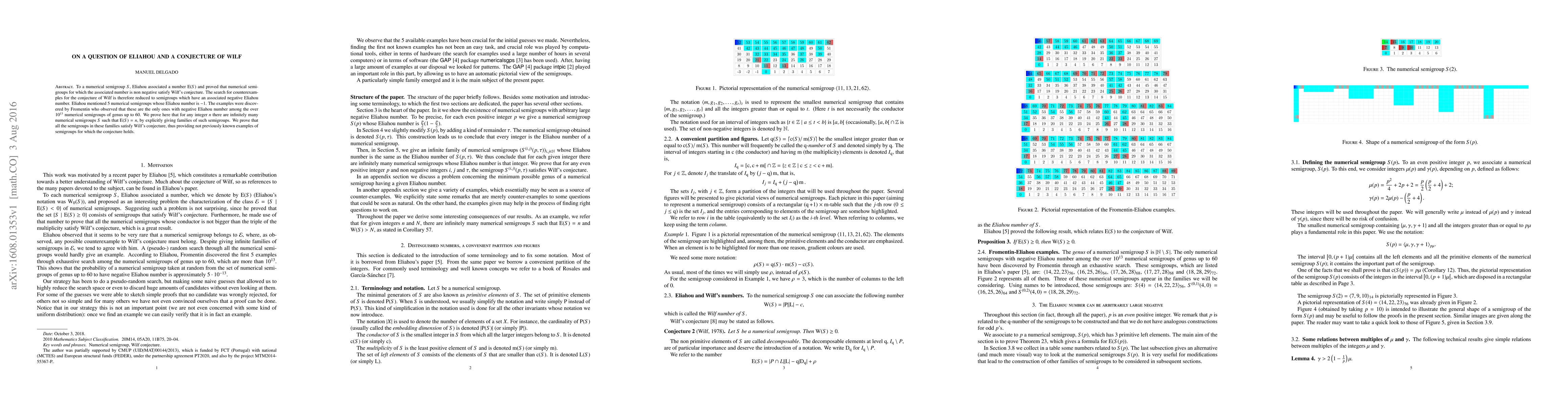 To a numerical semigroup $S$, Eliahou associated a number $E(S)$ and proved that numerical semigroups for which the associated number is non negative satisfy Wilf's conjecture. The search for counterexamples for the conjecture of Wilf is therefore reduced to semigroups which have an associated negative Eliahou number. Eliahou mentioned $5$ numerical semigroups whose Eliahou number is $-1$. The examples were discovered by Fromentin who observed that these are the only ones with negative Eliahou number among the over $10^{13}$ numerical semigroups of genus up to $60$. We prove here that for any integer $n$ there are infinitely many numerical semigroups S such that $E(S)=n$, by explicitly giving families of such semigroups. We prove that all the semigroups in these families satisfy Wilf's conjecture, thus providing not previously known examples of semigroups for which the conjecture holds.