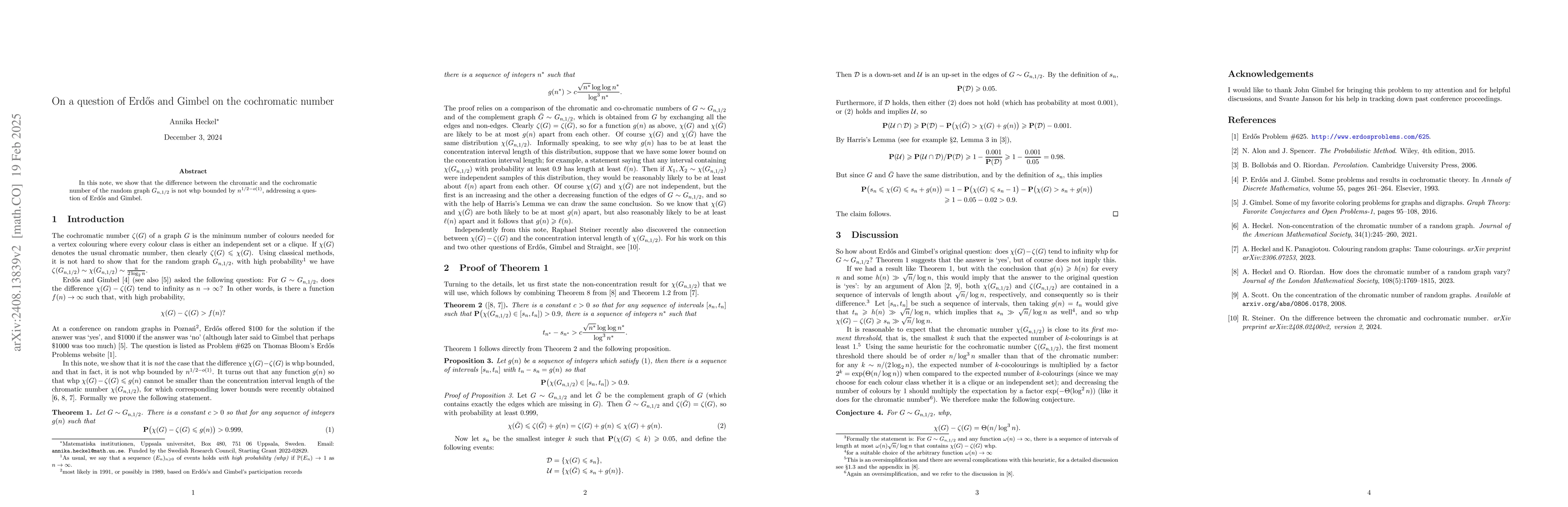 Summary: This paper demonstrates that the difference between the chromatic and cochromatic numbers in the random graph $G_{n,1/2}$ is not, with high probability, bounded by $n^{1/2-o(1)}$, resolving a question posed by Erdős and Gimbel.