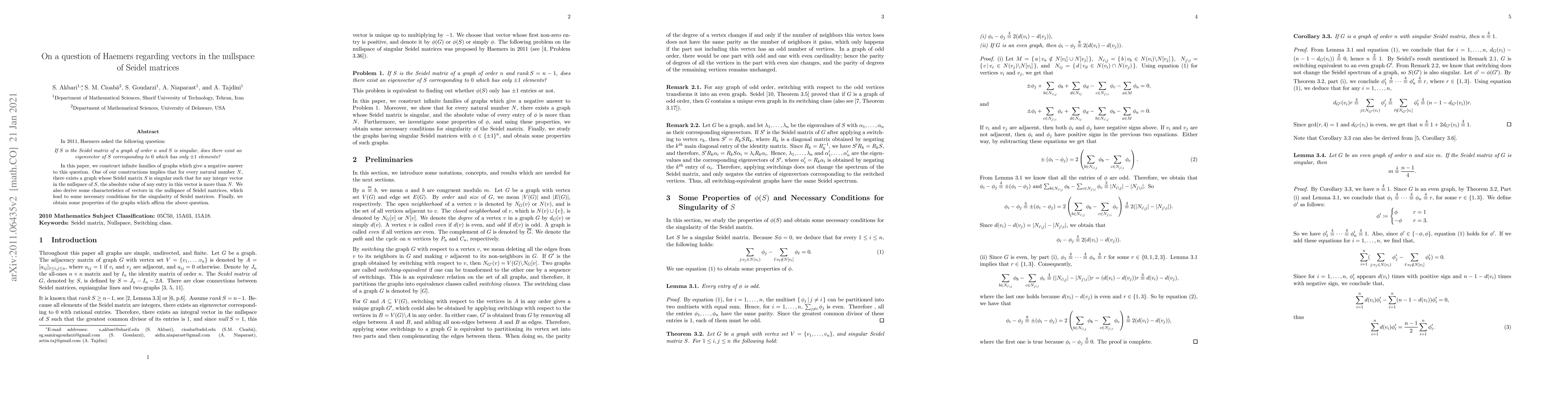 This paper addresses Haemers' 2011 question on the existence of a zero-eigenvector with $\pm 1$ entries in the nullspace of singular Seidel matrices. It constructs infinite families of graphs proving the question's negative answer and derives characteristics of nullspace vectors, establishing necessary conditions for Seidel matrix singularity.